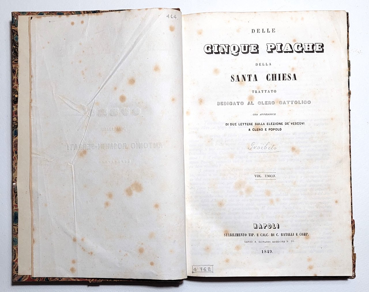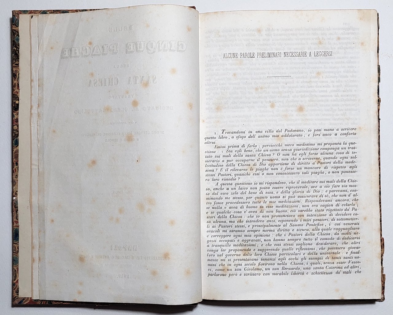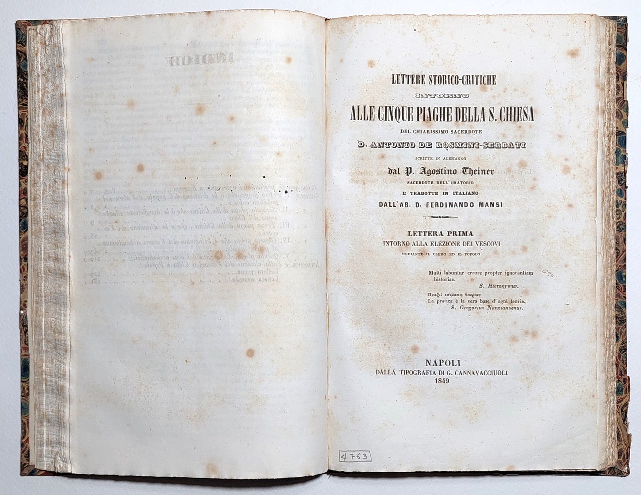 Miscellanea di due volumi Delle Cinque Piaghe della Santa chiesa trattato dedicato al clero cattolico con appendice di due lettere sulla elezione dei Vescovi a clero e popolo volume unico Napoli stabilimento Batelli 1849 e Lettere storico-critiche intorno alle 5 piaghe della Santa chiesa del chiarissimo sacerdote D. Antonio De Rosmini-Serbati scritte in Alemanno dal padre Agostino Theiner sacerdote dell'oratorio e tradotte in italiano dalla Abate D. Ferdinando Mansi lettera prima intorno alle elezioni dei Vescovi mediante il clero e il popolo Napoli tipografia Cannavacciuoli 1849