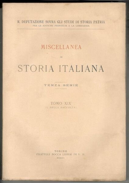 In 8°, pp. LVI, 557, (3). Brossura editoriale a stampa. Minimi segni del tempo e qualche leggera ingiallitura. Copia molto buona, interamente a fogli chiusi. Volume che contiene: BOSELLI, Paolo. Commemorazione dei soci defunti fatte dal Presidente alla Regia Deputazione di Storia Patria il 20 maggio 1919 e 3 giugno 1921. - SFORZA, Giovanni. La distruzione di Luni nella leggenda e nella storia. - BORNATE, Carlo. La guerra di Pietrasanta (1484-85). - LEMMI, Francesco. Diplomatici sardi nel periodo della Rivoluzione (1789-1796). - BOZZOLA, Annibale. Un capitano di guerra e signore subalpino - Guglielmo VII di Monferrato (1254-1292. - GEROLAMO, Biscaro. Inquisitori ed eretici lombardi (1292-1318).