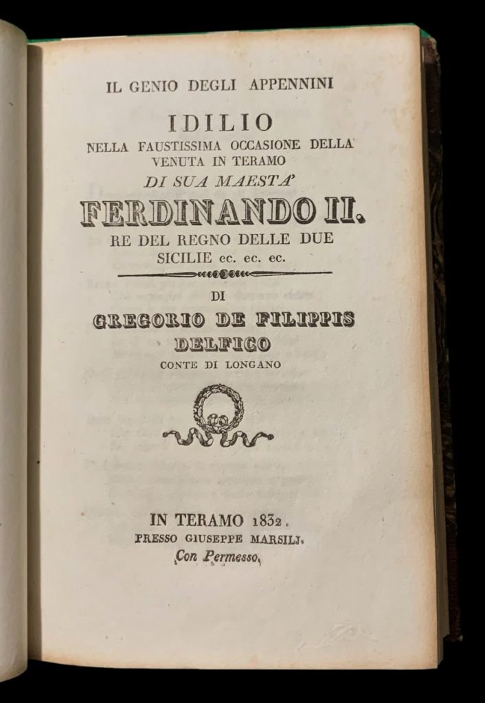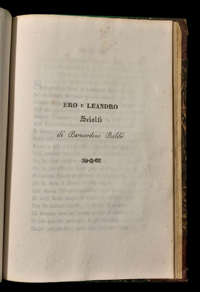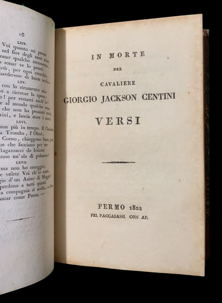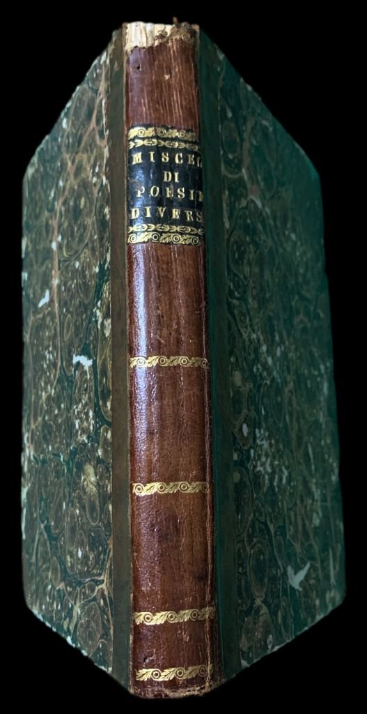 Machirelli Odoardo, Alla Cara memoria di Virginia Zanucchi, Pesaro, Per le Stampe del Nobili, 1834 (che contiene il Volgarizzamento della Sesta Meditazione Notturan di Odoardo Young intorno alla dimenticanza della Morte); 2) De Filippis Delfico Gregorio Conte di Longano, Il genio degli Appennini Idilio nella Faustissima occasione della venuta in Teramo di sua Maestà Ferdinando II, Re del Regno delle Due Sicilie, In Teramo, Presso Giuseppe Marsili, 1832; 3) Guadagnoli Antonio, Musica e Amore, Sestine, Pisa, Tipografia Nistri, 1828; 4) Autori vari (Tommaso Salvadori, Giuseppe Neroni, Giuseppe Garulli, Luigi Ambrosi Olivetano, Gaetano Cardona, Luigi Silvestri, Eurilla Ascrea), In Morte del Cavaliere Giorgio Jackson Centini Versi, Fermo, Pel Paccasassi con Ap., 1822; 5) Secchi Giampietro, La Battaglia de' nomi e de' verbi Poemetto Eroicomico del P. Giampietro Secchi della Compagnia di Gesù a trastullo de' Giovanetti che studiano la grammatica da Lui letto in una delle tornate dell'Accademia Tiberina, Ripatronsone, Tipografia Vescovile e Comunale Jaffei, 1835; 6) Cappelletti Eugenio, Per le nozze lietissime della Nobil Donzella Marchesa Luisa Passari di Fermo, col Nobil Signor Cavaliere Luigi Bandinelli Bianchi di Siena, Fermo, Tipografia Paccasassi, 1835; 7) Costa Paolo, Alla Gentil Donzella Marchesa Luigia Passeri da Fermo per leggiadria di forme e per virtudi pleclara nel dì che sacramento di fede maritale al Patrizio Senese, Cavaliere Luigi Paparoni Bandinelli Bianchi con fausti auspicij stringevole queste odi scelte di Anacreonte, Recate nella dolce favella d'Italia dal Chiarissimo Paolo Costa Saverio Orlando congratulandosi offeriva, Macerata, Dalla Tipografia di Alessandro Mancini, 1835; 8) Baldi Bernardino, Per le Nozze della Marchesa Luigia Passeri di Fermo col Marchese Luigi Bianchi di Siena (Ero e Leandro), Macerata, Tip. Di Ben. Di Antonio Cortesi, 1835.<BR>In 8° (19,5x12,8 cm); 8 placchette rilegate in un volume: 61, (3) pp., (2 b.), 18 pp., 16 pp., 38, (2) pp., (8) pp., 11, (1) pp., 31, (3 b.) pp., 30, (4) pp. Legatura coeva in mezza-pelle con titolo e ricchi fregi in oro dorso. Piatti foderati con carta marmorizzata coeva. Un lieve difetto al margine superiore del dorso e nel complesso, esemplare in buone-ottime condizioni di conservazione. Alla prima carta bianca l'elenco delle opere contenute nel volume scritto in chiara ed elegante grafia coeva. Rara miscellanea di non comuni componimenti, alcuni nuptalia ed alcuni funeralia, legati al territorio marchigiano e abruzzese. Una delle placchette è stampata in un raro luogo di stampa, Ripatronsone. Due placchette sono stampate a Fermo da Paccasassi. L'ultima opera presenta lo scritto del grande matematico, storico, antiquario e poeta urbinate, Bernardino Baldi (Urbino, 5 giugno 1553 Urbino, 10 ottobre 1617) Ero e Leandro. Fra le opere da segnalare, la prima edizione di Musica e Amore del grande poeta e letterato aretino, Antonio Guadagnoli (Arezzo, 15 dicembre 1798 Cortona, 21 febbraio 1858) e l'idillio il Genio degli Appennini che il Conte di Longano, Gregorio De Filippis Delfico (Napoli, 23 ottobre 1801 Notaresco, 4 maggio 1847), celeberrimo politico, poeta e scrittore italiano cittadino sammarinese, famoso per la cura con la quale conservò la biblioteca dello zio Melchiorre, dedica qui alla venuta a Teramo, della quale provincia, dal 1841, Delfico fu presidente, di sua maestà Ferdinando II Borbone Re del Regno delle Due Sicilie. Delfico oltre a ricoprire diverse importanti cariche pubbliche, partecipò all'istituzione dell'Orto Botanico di Teramo e cercò di mettere in atto le più importanti innovazioni agronomiche della sua epoca, applicandole ai vasti possedimenti sui nei territori molisani di Longano. Intellettuale di primo piano nel panorama nazionale della penisola italiana fu in corrispondenza con alcuni dei più importanti personaggi della sua epoca e corposo e vivo, fu, in particolare, il suo rapporto epistolare con Giacomo Leopardi. Importante miscellanea di rare opere di interesse letterario.