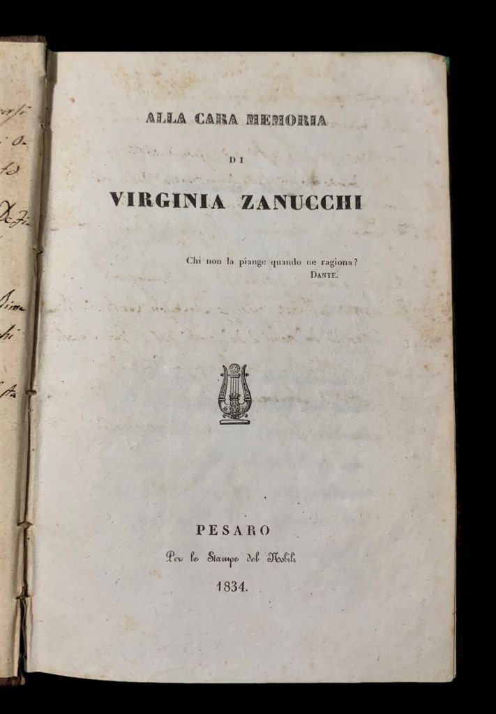 Miscellanea poetica di 8 rare opere di interesse marchigiano, molisano ed abruzzese, stampate, alcune, da rari stampatori o in rari luoghi di stampa come Ripatronsone.1) Machirelli Odoardo, Alla Cara memoria di Virginia Zanucchi, Pesaro, 1834.