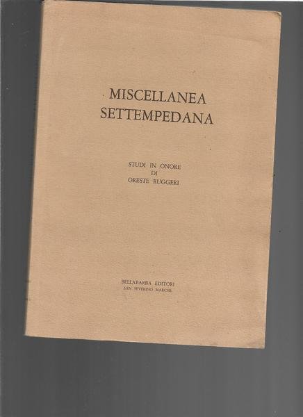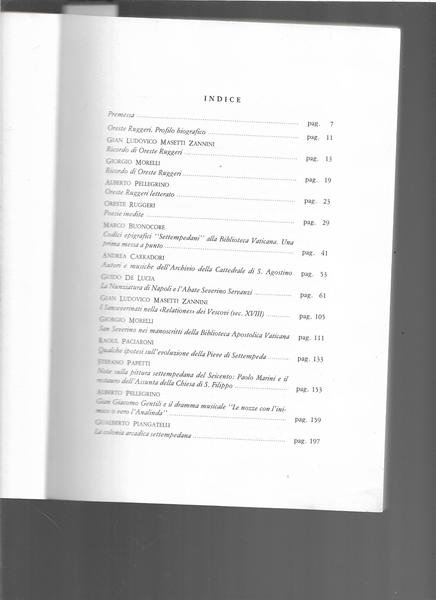 8°, pp. 221 (3) con ill. n.t. Br. edit.<BR>Indice: Oreste Ruggeri. Profilo biografico - Gian Ludovicoo Masetti Zannini - Ricordo di Oreste Ruggieri; Giorgio Morelli - Ricordo di O.R.; Alberto Pellegrino - Oreste Ruggieri letterato; O.R. - Poesie inedite; Marco Buonocore - Codici epigrafici "Settempedani" alla Biblioteca Vaticana. Una prima messa a punto; Andrea Carradori - Autori e musiche dell'Archivio della Cattedrale di S. Agostino; Guido De Luca - La Nunziatura di Napoli e l'Abate Saverino Servanzi; Gian Ludovico Masetti Zannini - I Sanseveritani nella "Relationes" dei Vescovi (sec. XVIII); Giorgio Morelli - San Severino nei manoscritti della Biblioteca Apostolica Vaticana; Raoul Paciaroni - Qualche ipotesi sull'evoluzione della Pieve di Settempeda; Stefano Papetti - Note sulla pittura settempedana del Seicento: Paolo Marini e il restauro dell'Assunta della Chiesa di San Filippo; Alberto Pellegrino - Gian Giacomo Gentili e il dramma musicale "Le nozze con l'inimico o vero l'Analinda"; Gualberto Puangatelli - La colonia arcadica settempedana.