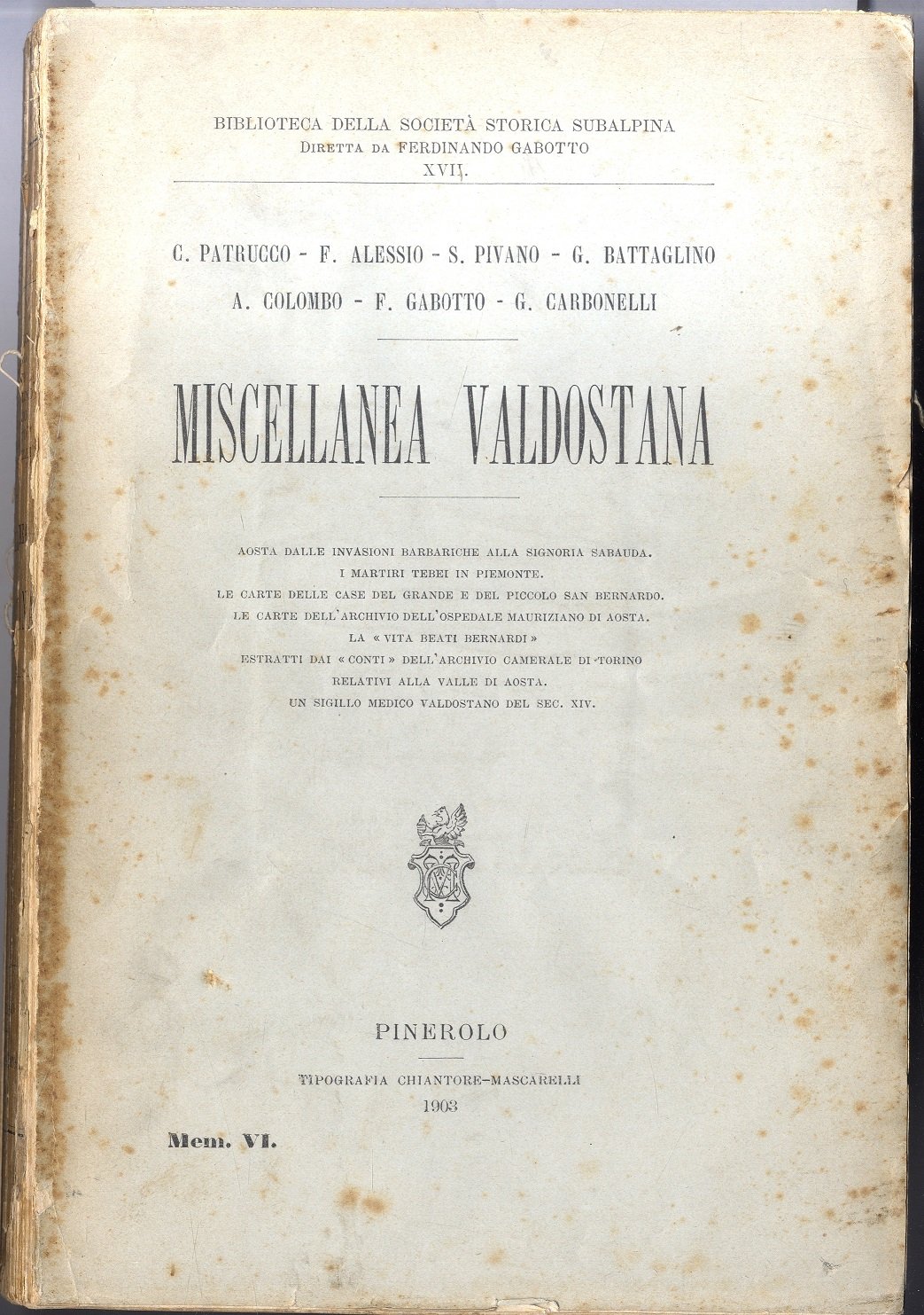>in-4, pp. LXXXVIII, 423, broch. edit scucita. Con alcune illustraz. in fototipia f.t. Il volume contiene i seguenti interessanti studi storici: Aosta dalle invasioni barbariche alla signoria Sabauda, I martiri Tebei in Piemonte, Le carte delle case del Grande e del Piccolo San Bernardo, Le carte dell'archivio dell'ospedale Mauriziano di Aosta, La ''Vita dei Beati Bernardi'', Estratti dai ''conti'' dall'Archivio camerale di Torino relativi alla valle d'Aosta, Un sigillo medico valdostano el sec. XIV. Ne sono autori C. Patrucco, F. Alessio, S. Pivano, G. Battaglino, A. Colombo, F. Gabotto, G. Carbonelli. (Vol. XVII della collana: Bibl. Soc. Storica Subalpina).