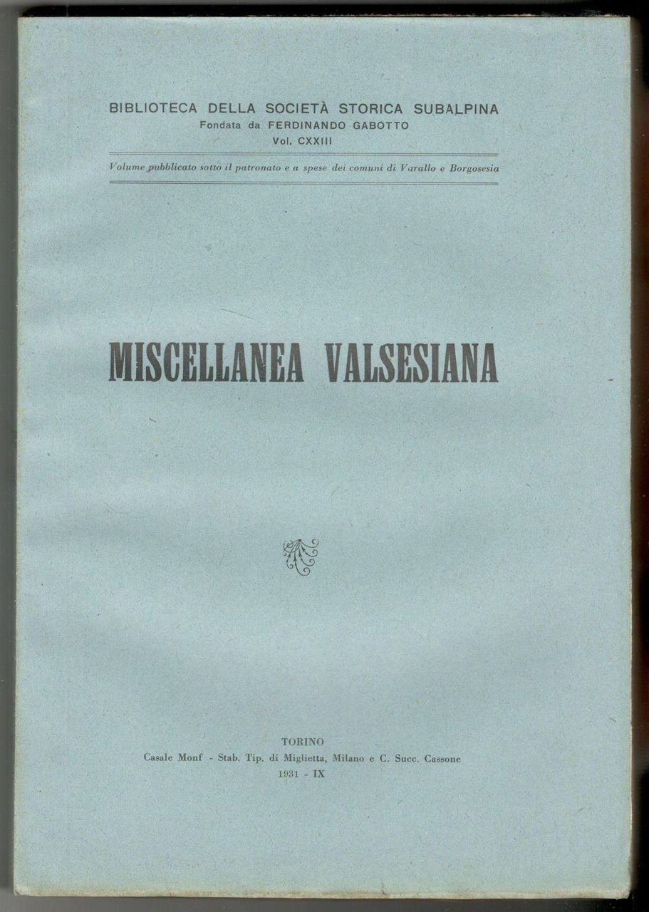 In 8°, pp. 311, (1, 8 di catalogo editoriale su carta verde). Brossura editoriale. Leggere ingialliture. Copia in ottimo stato, interamente a fogli chiusi. Con numerose illustrazioni fuori testo. Volume pubblicato sotto il patronato e a spese dei comuni di Varallo e Borgosesia. Biblioteca della Società Storica Subalpina fondata da Ferdinando Gabotto, CXXIII.