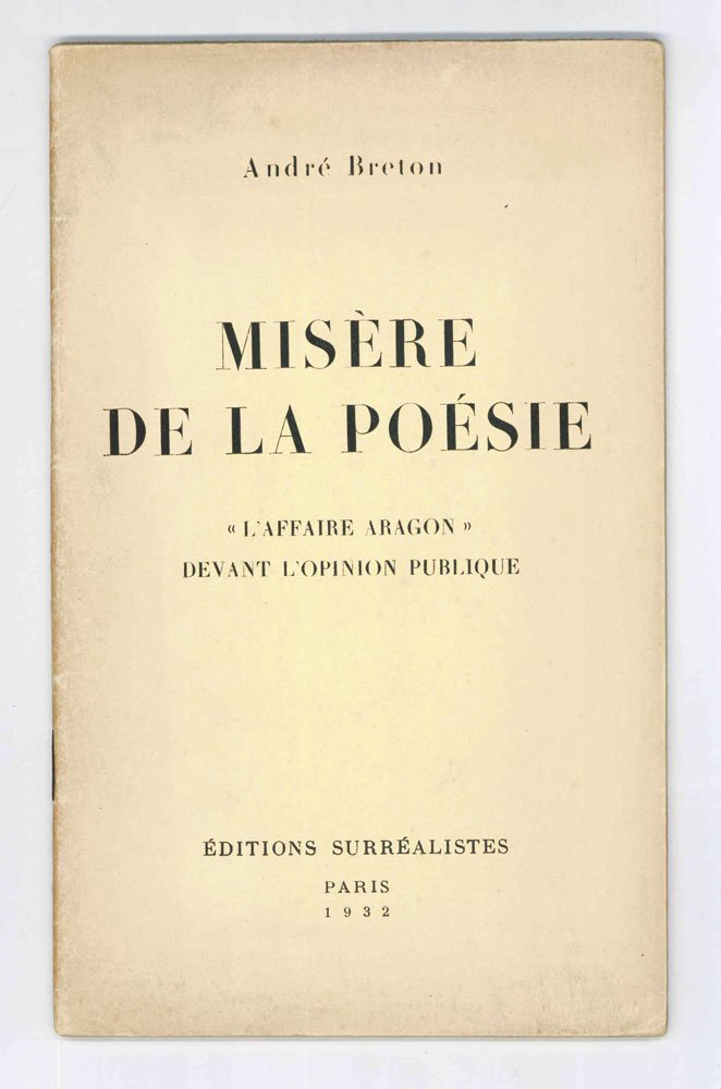 LIBROEdizione originale.Ottimo esemplare, fresco e pulito, a fogli chiusi.Secondo intervento pubblico di Andrè Breton in reazione alla bizzarra accusa rivolta a Luis Aragon nel gennaio 1932, quando il suo componimento «Front rouge» fu denunciato per sobillazione militare, istigazione all’omicidio e propaganda anarchica. La proposta di Breton a difesa di Aragon, in realtà, si collocava entro un dibattito molto più ampio incentrato sulle qualità politiche “attive” della letteratura, laddove la proposta bretoniana di una “immunità letteraria” sembrò piuttosto sostanziare la linea di un surrealismo apolitico. «On aurait tort de considérer comme anecdotique la querelle entre Breton et Aragon. Ce sont deux conceptions antagonistes de la littérature qui s’affrontent cette année-là. Dans un premier temps, Breton et le groupe surréaliste vont prendre la défense de Louis Aragon dans un tract [«L’Affaire Aragon»]: ils en appellent, dans les grandes lignes, à l’immunité pour le poète. “L’Humanité”, dans un contexte déjà conflictuel avec le surréalisme, va précisément s’opposer à cette immunité. Et toute la question de la responsabilité et de l’engagement se pose déjà. Pour l’organe du PCF, Breton et les surréalistes seraient coupables de ne pas assumer leur vocation révolutionnaire. Dans un second temps, Breton écrit alors “Misère de la poésie”; la référence à Marx est claire et son objectif aussi: réussir à conserver l’intégrité du projet surréaliste, en toute indépendance, tout en restant fidèle au marxisme et au matérialisme historique. Dans les grandes lignes, il condamne, encore à demi-mot, l’orientation esthético-politique de Louis Aragon; corollairement, il définit l’orientation du surréalisme à partir des années 30» (Th. Boixière, «Front rouge», articolo online su «The Conversation, 19 feb. 2018).