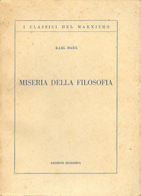 2. ed. 191 p. ; 21 x 15 cm. I classici del marxismo, 23. L'opera è stata scritta da Marx in francese tra il dicembre 1846 e il 15 giugno 1847 e pubblicata nel luglio 1847. Il saggio rappresenta nell'opera complessiva di Marx la nascita dell'analisi dell'economia classica attraverso la polemica contro l'ideologia libertaria di Proudhon. Prefazione di Friedrich Engels. Titolo originario dell'opera: «Misère de la philosophie. Réponse à la philosophie de la misère di M. Proudhon» (Paris-Bruxelles, A. Frank-C.G. Vogler, 1847). Traduzione di Franco Rodano. Brossura editoriale, coperta in cartoncino flessibile con alette, titolo impresso al piatto e al dorso. Lievi segni del tempo alla coperta e ai tagli (ingiallimento della carta e piccole fioriture), per il resto esemplare integro. Codice libreria 7638.