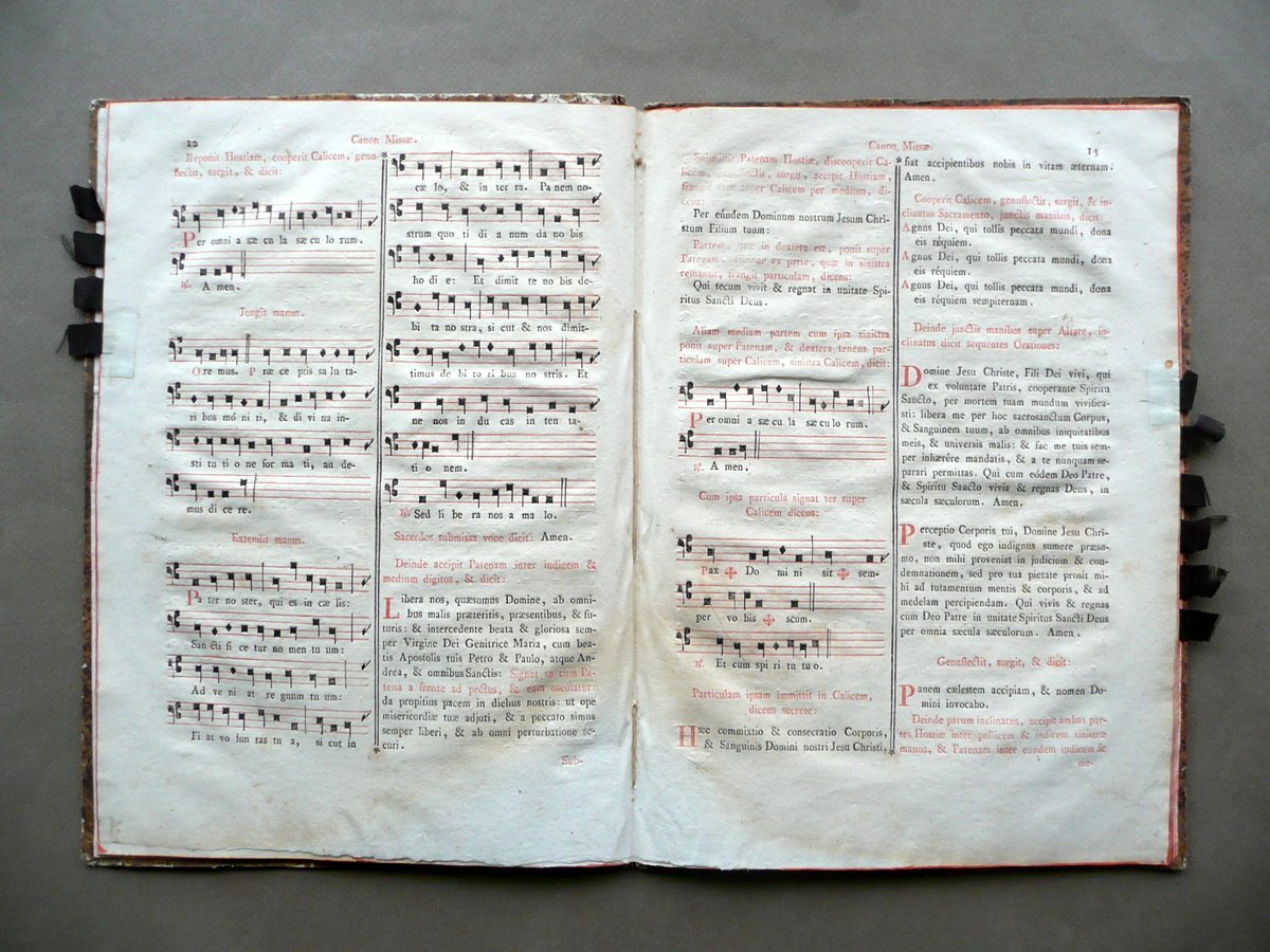 Missae In Agenda Defunctorum Tantum deservientes Ex missali romano Recognitio desumptae cum ordinario et canone ut in ipsis servatur Ad usum et commoditatem omnium ecclesiarum Remondini, Bassano 1817, cm 34x24,5, pp. 24, con qualche partitura e una bella tavola incisa in b/n fuori t. (vedi foto); frontespizio con bella ill. incisa in b/n; testo bicolore (in nero e in rosso). Legatura d'epoca muta in tutto cartonato rivestito in carta marmorizzata; tagli rossi. Margine est. di alcune pagine con richiamo in stoffa applicato entro braghette cartacee (vedi foto). Testo in latino. Condizioni di conservazione Esemplare in buone condizioni con tracce d'uso, coperta con alcuni minimi difetti e qualche leggera abrasione; angoli dei piatti con pochi piccoli strappetti. Interni buoni con qualche piccola leggerissima brunitura. Bel prontuario" d'epoca per messe da eseguirsi in memoria dei defunti, con qualche partitura e una bella tavola incisa in bianco e nero fuori testo. Testo in latino. SETT115.L10947 N "