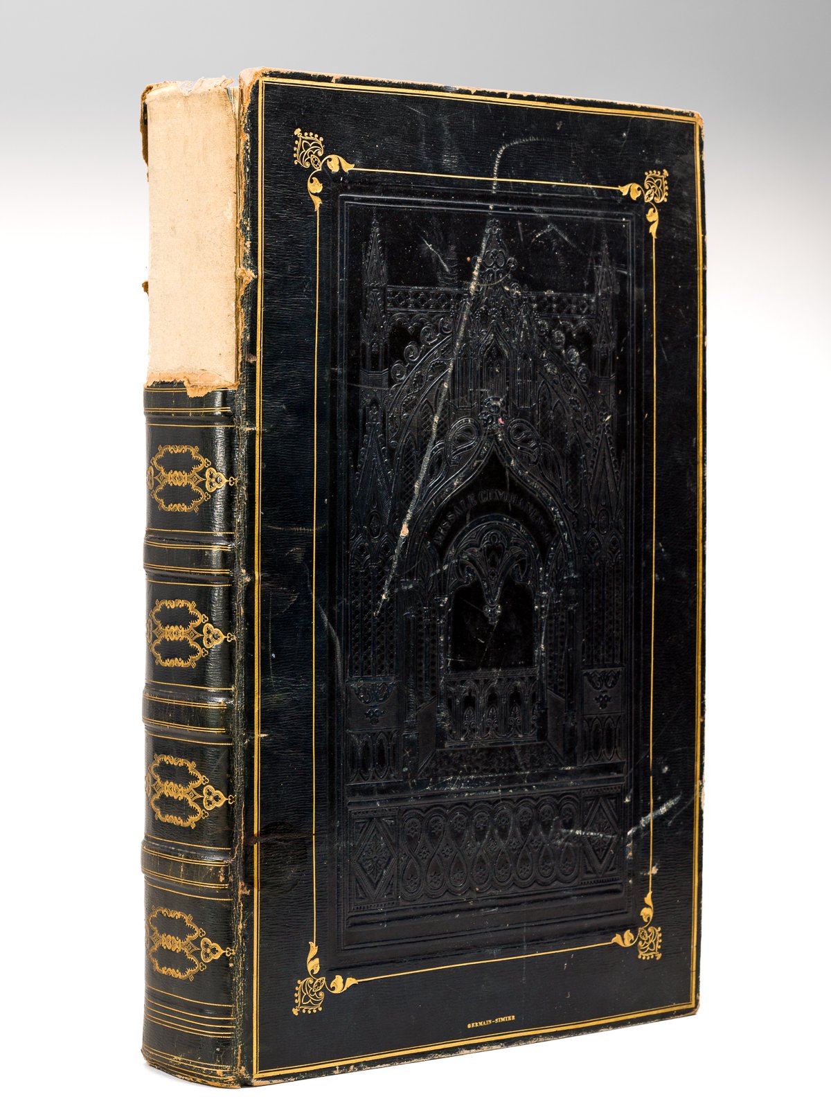1 vol. in-folio (425 x 270 mm.) reliure de l'époque plein maroquin à grain long bleu, plats ornés d'un grand décor à la cathédrale estampé à froid, dos à 5 nerfs dorés, filets dorés orné en plats, coupes et chasses ornées, toutes tranches dorées, reliure signée de Germain-Simier, Ex Tyopgraphia Caroli Monnoyer [ Charles Monnoyer ], Le Mans, 1835. Rappel du titre complet : Missale Cenomanense, DD. Caroli-Ludovici de Froullay, mandato editum, DD. Philippi-Mariae-Theresiae-Guidonis Carron jusu recognitum, illustrissimi ac reverendissimi in Christo Patris et Domini Joannis-Baptistae Bouvier, Cenomensis Episcopi Rare exemplaire de ce missel, établi dans une spectaculaire reliure à la cathédrale, de format très inhabituel. Si Fléty indique que Germain-Simier "n'avait aucun lien de parenté avec les trois autres" Simier, originaires du Mans, le thème de ce Missel semble infirmer ses propos. On connait un autre exemplaire de missel en reliure identique, à la seule exception de sa couleur (verte), provenant de la bibliothèque d'Henri Béraldi. Etat moyen (reliure faible, une importante partie du dos est détachée, mais conservée, ex-libris N. Rousseau). Prix en l'état pour cette pièce remarquable.