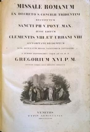 Missale romanum ex decreto S. Concilii Tridentini restitutum Sancti Pii V Pont. Max. jussu editum Clementis VIII et Urbani VIII auctoritate recognitum. Nunc denuo cum missis sanctorum novissime a summis Pontificibus usque ad SS. D. N. Gregorium XVI P. M. concessis suisque locis dispositis impressum.
