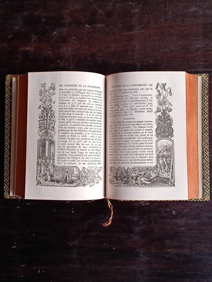 In-12° (cm. 14,4), bella legatura coeva in pieno marocchino, dorso liscio con titolo in oro (lievi tracce d'uso), labbri ornati da filetti in oro, tagli dorati, risguardi in carta decorata da fiori in oro, eleganti fregi sempre in oro alle unghiature; pp. [8] 504 in ottimo stato; con 1 bella tavola in litografia di Dujardin sul dipinto di Jouvenet all'antiporta fuori testo protetta da velina, occhietto e frontespizio inquadrati da eleganti cornici architettoniche incise, testatine e capilettera figurati. Messalino con testo in latino e in francese su due colonne, interamente illustrato con cornici ai bordi con scene delle Crociate e della tradizione cavalleresca. Ottimo esemplare. (NJ6)