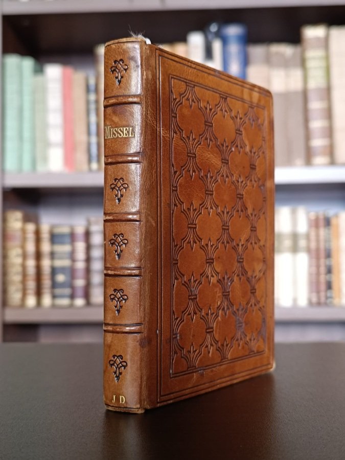 In-24° (cm. 14,4), pp. 431 [1] in ottimo stato. Bellissima legatura in piena pelle nocciola, ai piatti una doppia cornice di filetti delimita al centro una ricca trama di fregi impressi a secco, dorso a nervi con titolo in oro e fregi in nero ai comparti (leggerissime abrasioni), iniziali «JD» in oro al piede; labbri ornati in oro; filetti sempre in oro alle unghiature; risguardi marmorizzati; tagli dorati. Messalino romano interamente ornato da cornici figurate che illustrano scene della vita di Giovanna d'Arco; con 6 tavole in eliografia fuori testo, protette da velina, di cui 1 all'antiporta. Ottimo esemplare.