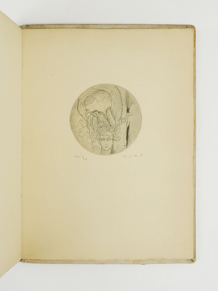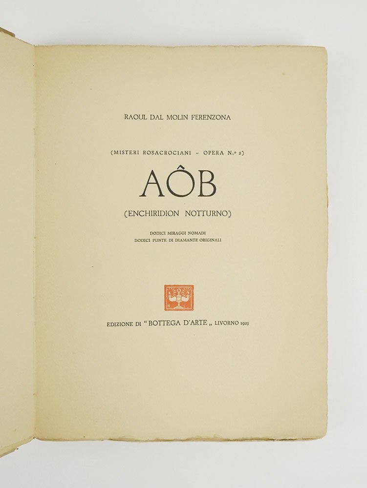 LIBROEdizione originale con tiratura limitata a 50 esemplari.CON AUTOGRAFO.Esemplare numero 20 di 50 numerati, con dodici incisioni numerate e firmate a matita dall’artista, entro squisita legatura fatta appositamente realizzare e illustrata a mano. Rinforzo professionale alle cerniere, originariamente allentate; per il resto in ottime condizioni.Rarissimo — con un solo esemplare censito nell’Opac Sbn conservato presso la Biblioteca nazionale centrale di Firenze — e prezioso libro d’artista tirato in cinquanta esemplari numerati dell’incisore, scultore, pittore, poeta e scrittore fiorentino Raoul Dal Molin Ferenzona, tra i più affascinanti interpreti della vena esoterica del simbolismo artistico e letterario italiano. Animo inquieto alla perenne ricerca di un’intimità piena con i misteri delle forze cosmiche, la sua formazione avvenne dapprima tra Firenze e Palermo — dove fu allievo di Ettore Ximenes — e poi in giro per l’Europa, seguendo le tracce degli amatissimi preraffaelliti inglesi e subendo decisamente l’influenza degli artisti riuniti nella Secessione di Monaco, in particolare le opere di Franz Von Stuck che ebbe modo di ammirare nel 1902 durante un soggiorno proprio a Monaco di Baviera. Già autore nel 1900 di «Primule (novelle gentili)» e del romanzo breve «Mio figlio», nel 1912 diede alle stampe la raccolta di poemi e disegni mistico-simbolista «La ghirlanda di stelle», dedicata a Sergio Corazzini. Sensibilissimo e incapace di separare dimensione artistico-estetica ed esistenza, attraversato da crisi e vocazioni spirituali — che lo portarono, nel 1918, a trascorrere un periodo nel monastero benedettino di Santa Francesca Romana — a partire dagli anni venti fu soprattutto il mondo cristiano-cabalistico dei Rosacroce a dominare la mente e l’opera di Ferenzona, come testimonia questo «AÔB (Enchiridion notturno)», opera seconda dei «Misteri rosacrociani», aperto dalla dedicatoria «Al mio indimenticabile, indivisibile, invisibile fratello Frederick Chopin». Composto da dodici evocative illustrazioni numerate e firmate incise a punta di diamante — tecnica prediletta, insieme alla puntasecca, dall’artista toscano, capace di donare un segno leggero ed etereo, benché preciso — e da dodici poemi colorati da scenari medievaleggianti a un tempo cupi e di rinascita, impastati di vita e di morte, di misteri insieme cosmici e sensuali, il volume rilegato in pergamena con il piatto anteriore decorato a mano da Ferenzona (autore anche dei fregi nel testo e dei capilettera), venne stampato nelle Officine Belforte dalle edizioni della livornese Bottega d’Arte. Costola editoriale dell’omonima galleria fondata nel 1921 da Gino Belforte che nel gennaio del 1923 aveva ospitato una mostra personale di Ferenzona, le «Edizioni di “Bottega d’Arte”» raccolsero e rilanciarono attraverso il lavoro di Gino e del fratello Guido la tradizione libraia della famiglia ebraico-livornese Belforte cominciata nel 1805 e straordinariamente rappresentata dalla creazione della Belforte & Co, storica casa editrice fondata nel 1834 da Salomone Belforte e tuttora attiva.Bardazzi, Raoul Dal Molin Ferenzona: secretum meum (Firenze 2002), pp. 74-75; Parisi, Arte e magia (2018), n. 228-229 p. 278