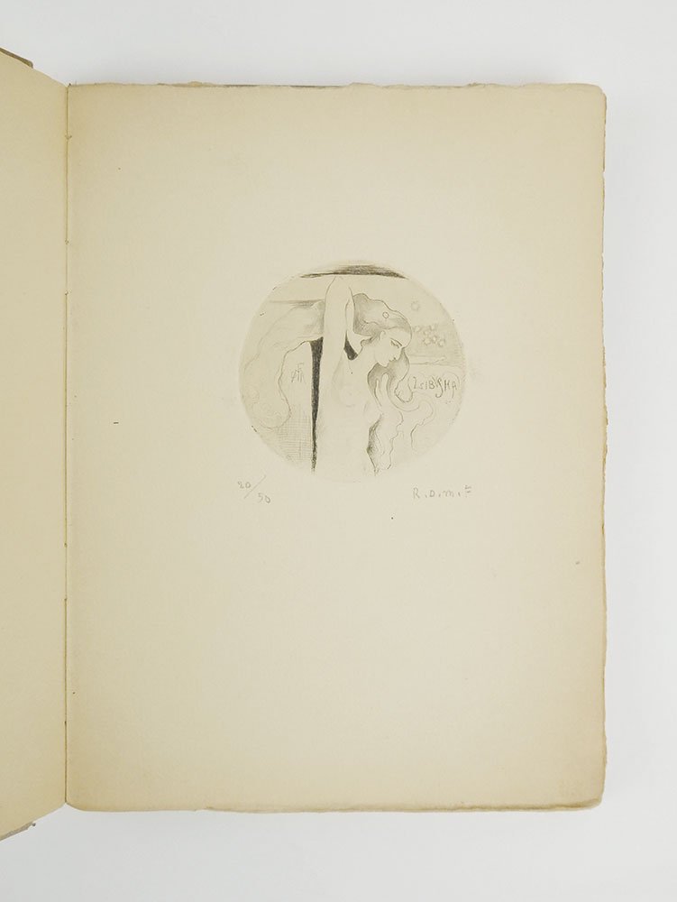 - legatura appositamente realizzata dall’artista in piena pergamena chiara, disegno autografo al piatto anteriore eseguito a mano e titoli manoscritti,