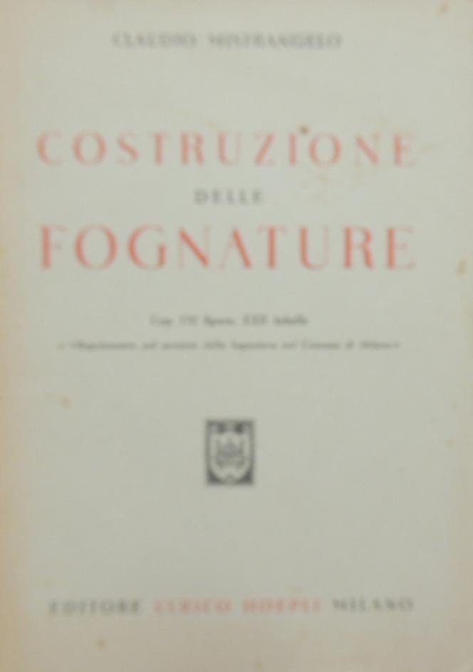 Claudio Mistrangelo, Costruzione delle fognature, con 170 figure, XXII tabelle e Regolamento pel servizio della fognatura nel Comune di Milano, Editore Ulrico Hoepli, Milano 1945, VIII, 252, ill. b.n., cm 25, br. ed. Minime fioriture, leggera brunitura della carta, per il resto buona copia, in gran parte intonsa.