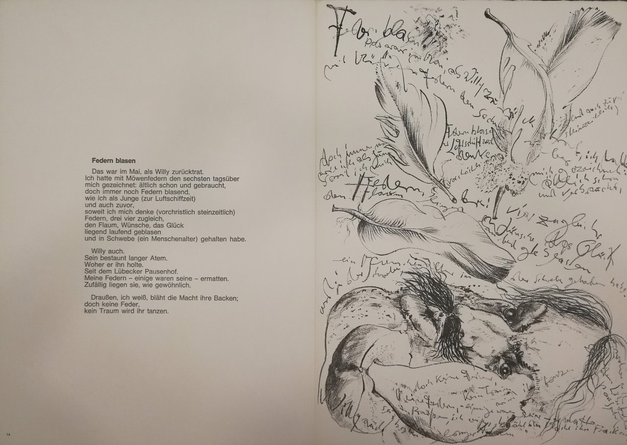 In folio (mm. 500x355), astuccio e custodia in cartonato editoriale contenente, a fogli sciolti, pp. 47,(5); illustrato da 20 pregevoli litografie originali (di cui 5 a doppia pagina) di Gunther Grass, autore anche delle 9 poesie, tradotte in italiano da Luciano Barile (A funghi con Sofia), poste al fine. Le litografie sono state tirate coi torchi di Giorgio Upiglio su carta Filicarta. I testi sono stati composti in carattere Haas nerissimo e in Helvetica chiaro su progetto grafico di Piero Marras. Bella edizione in tiratura di 99 + XXXVI esemplari numerati e firmati dall'Autore. Il ns., 32, è molto ben conservato.