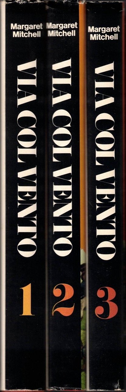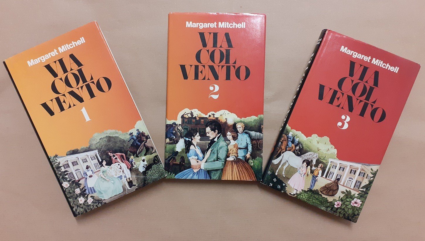 Margaret Mitchell, Via col vento, traduzione di Ada Salvatore ed Enrico Piceni, Club del Libro, s.l. (ma stampato a Cles, presso la Nuova Stampa di Mondadori) 1982, 3 voll., pp. totali 1060, cm 21, cart. ed. con titoli e fregi in oro al dorso, fregi a impressione al piatto e sovraccoperta. Edizione Club del Libro su licenza della Arnoldo Mondadori Editore. Titolo originale: Gone with the wind. Volume primo: pp. 344. Volume secondo: pp. 351-695. Volume terzo: pp. 699-1060. Uno strappetto senza mancanze alla sovraccoperta del primo volume, lievi tracce d’uso, minime fioriture, leggera brunitura della carta per il resto ottimi.