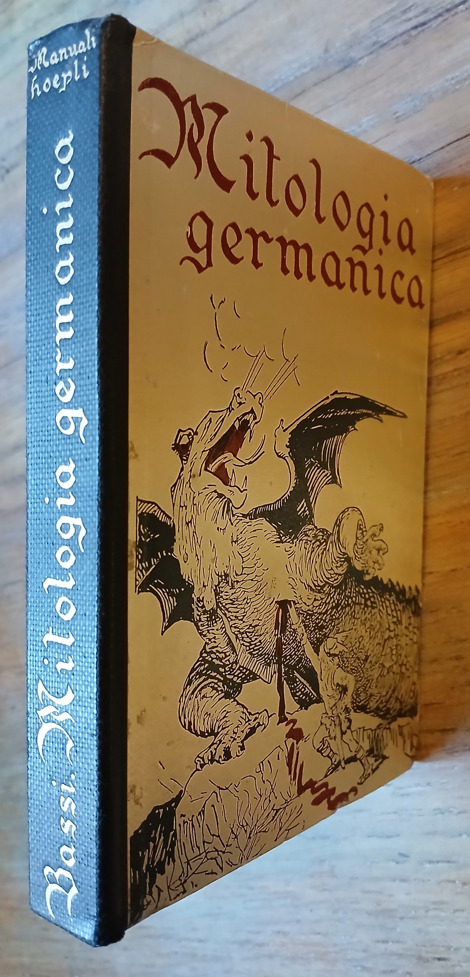 (Mitologia; Nord Europa; Leggende) In 16°, legatura editoriale in mezza tela nera con titoli impressi in oro al dorso, piatti in cartone con applicata carta a fondo argento, al piatto anteriore titolo ed illustrazione in rosso e nero, al piatto posteriore logo Hoepli in rosso e prezzo del volume impresso a secco, guardie in carta editoriale, pp. XIX,(1),290, con 16 tavole fuori testo del pittore Gustavo Rosso (Gustavino). Prima ed unica edizione. Esemplare fresco e ben conservato.