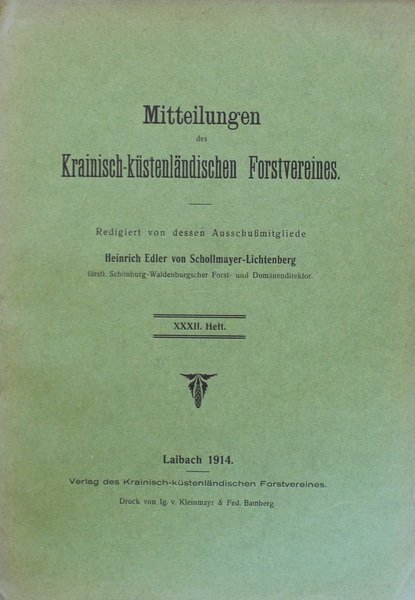 Laibach, Krainisch-kustenlandischen Forstvereines - Ig. v. Kleinmayr & Fed. Bamberg, 1914. In 8¡. 159 pp. Brossura editoriale, frontespizio con piccolo fregio replicato al piatto anteriore, ampi margini, testo in lingua tedesca, lieve ingiallimento usuale, qualche segno d'uso e arrossatura al margine della brossura, ma esemplare molto buono.