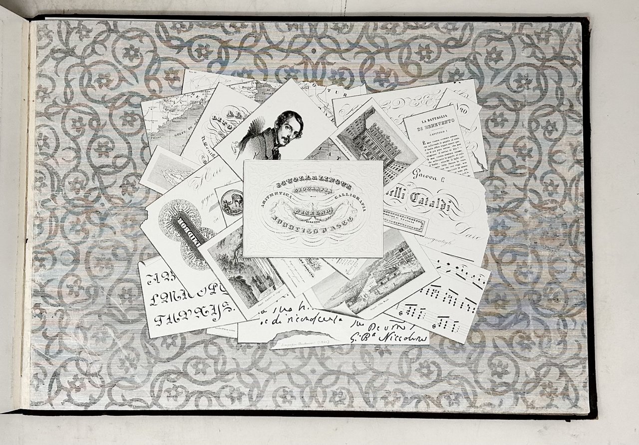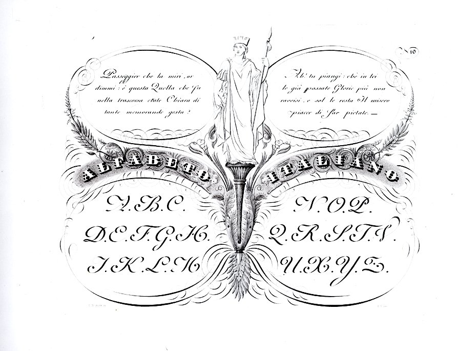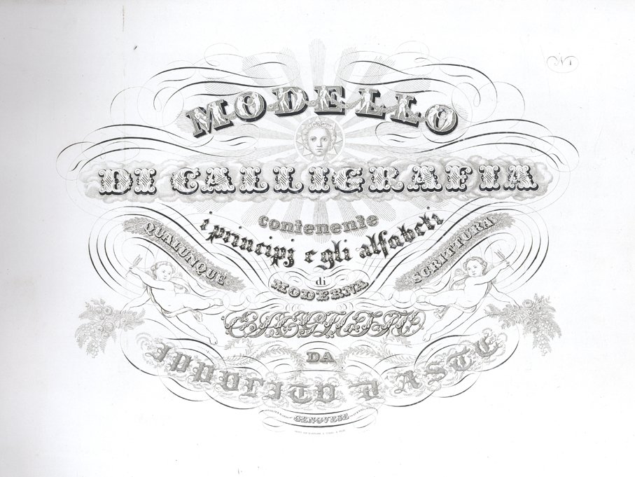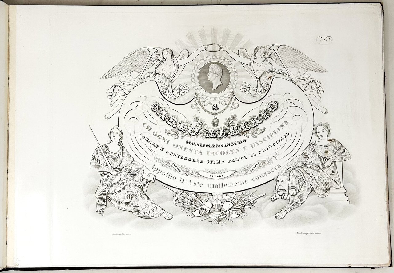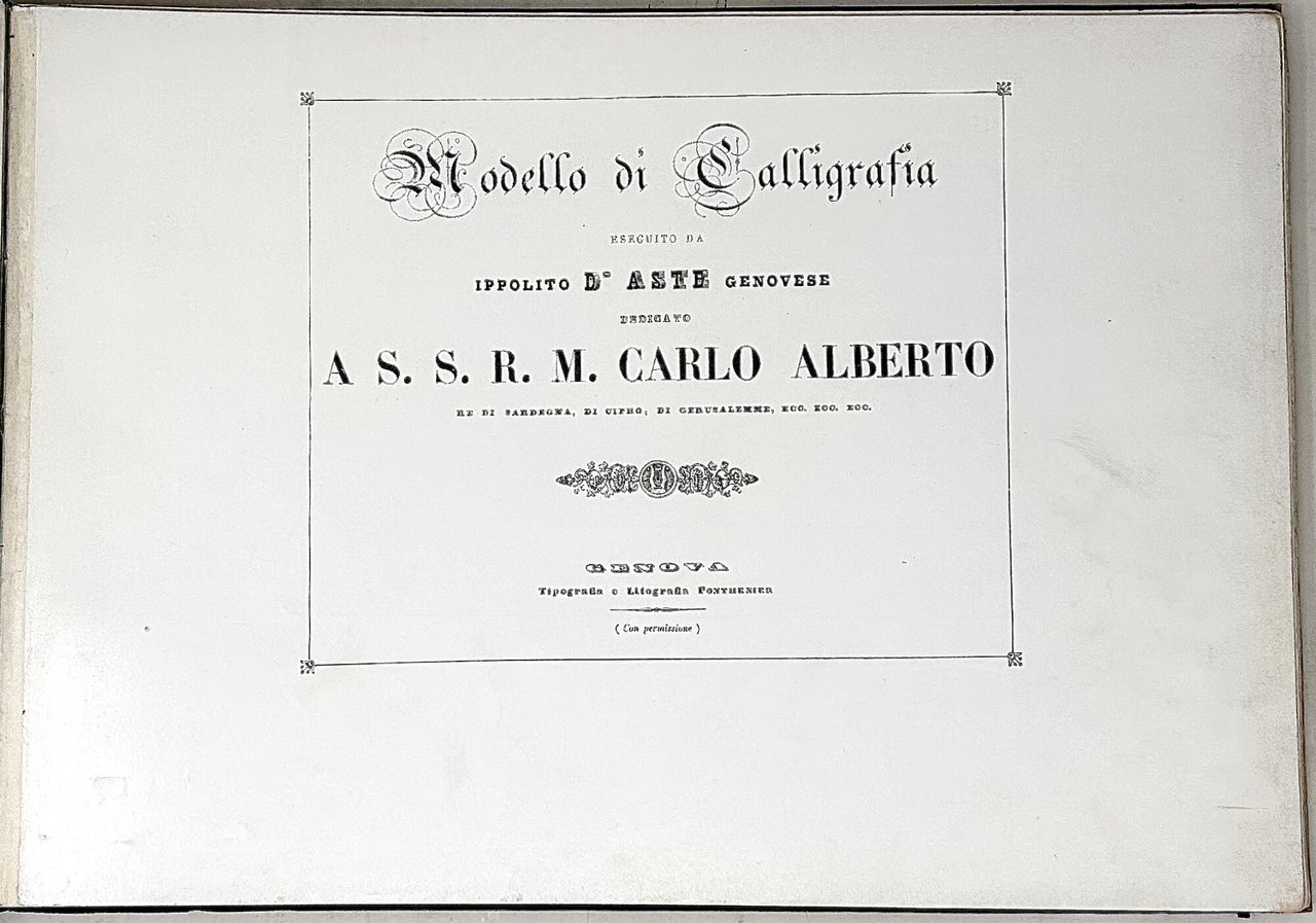 >in-folio oblungo (mm 295x430), pp. 8, 20 tavole numerate, legatura editoriale in tela. Prima edizione di questo raro lavoro di Ippolito D'Aste sulla calligrafia. Dedica a Carlo Alberto di Savoia. Le pagine iniziali contengono una prefazione dell'autore, datata 1840, in cui traccia una breve bibliografia dei principali volumi sull'argomento e tratta della scrittura inglese, italiana, francese, rotonda, gotica e tedesca. Le magnifiche tavole, firmate tra gli altri da fratelli Campo, C. Magrini, Casanova, Enr. Parmiani, Honoré Vidal, sono realizzate con una curiosa tecnica mista che oltre all'incisione e alla litografia, in alcuni casi, contempla anche l'utilizzo del colore. L'ultima tavola è un tromp-l'oeil formato da varie cartoline su fondo a ramage; le restanti tavole riportano, oltre ai consueti alfabeti, alcuni tributi ad artisti e letterati. Buon esemplare, (piccola macchia margine sup. tav. 14). Bonacini 459. Morison 48. OCLC First Search censisce un solo esempl. (Univ. del Texas).