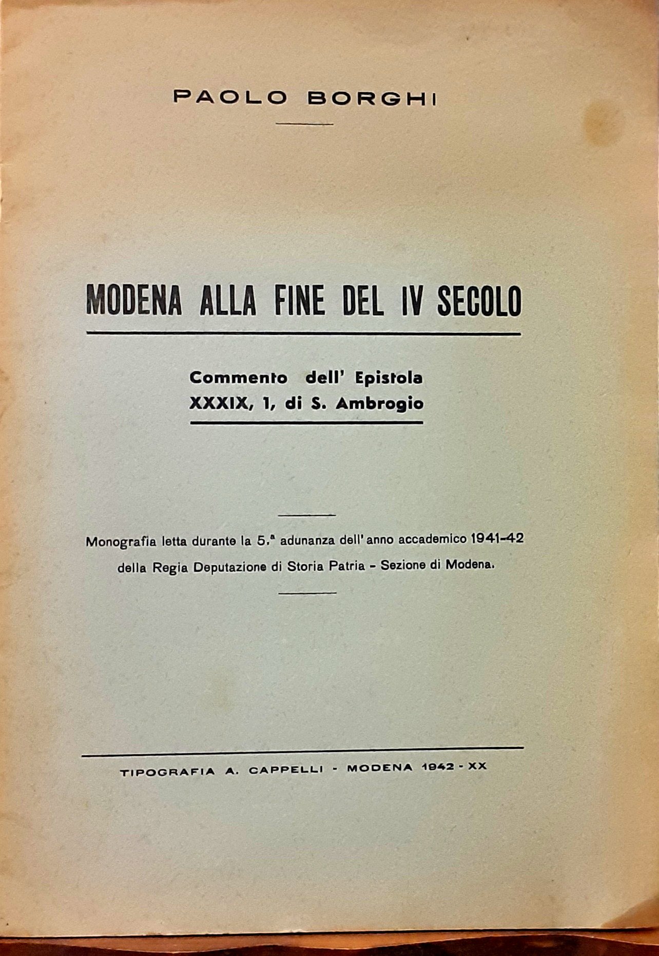 MODENA ALLA FINE DEL IV SECOLO: COMMENTO DELL'EPISTOLA XXXIX DI S. AMBROGIO. Monografia letta durante la 5° adunanza delL'Anno accademico 1941-42 della Regia Deputazione di Storia Patria-Sezione di Modena.