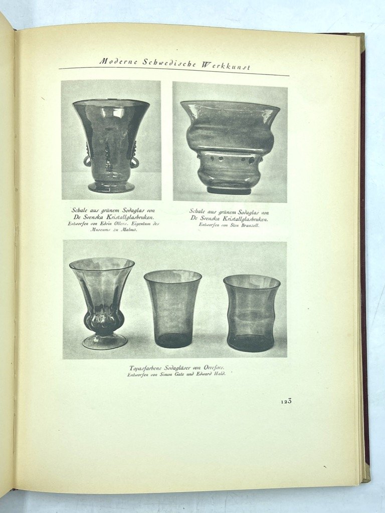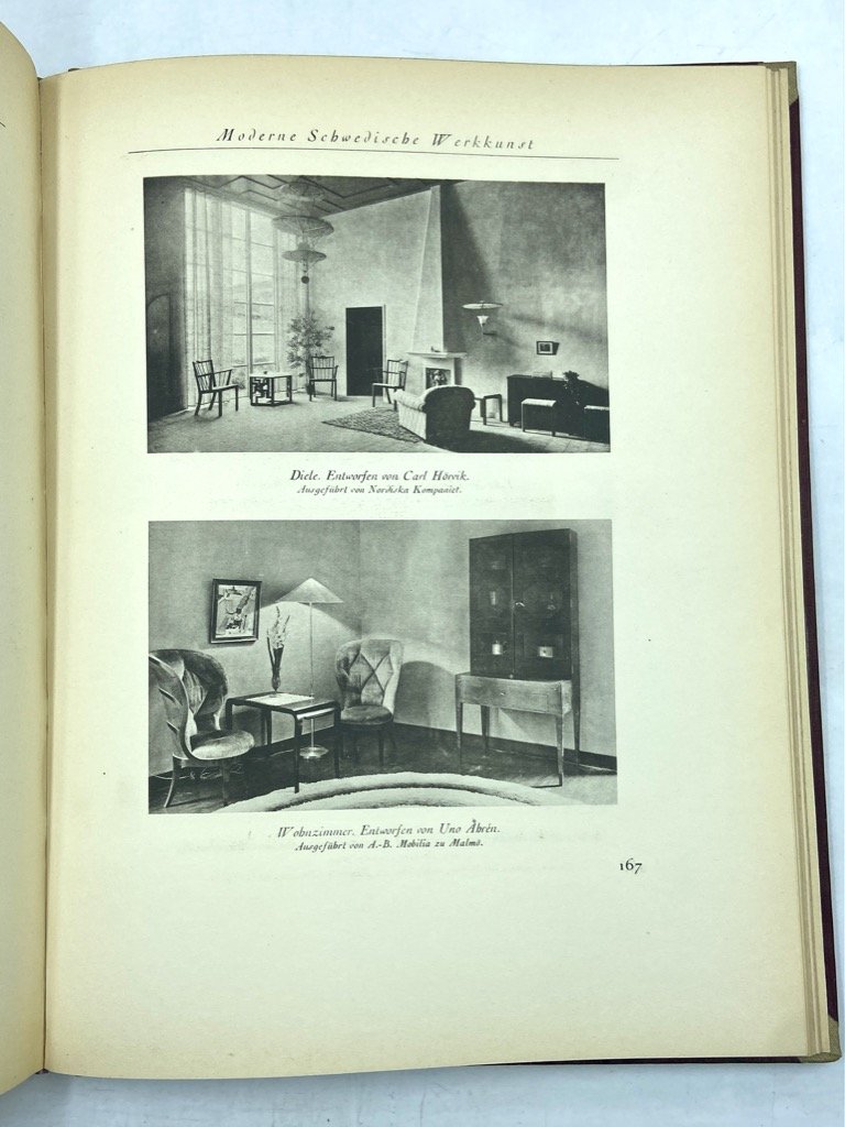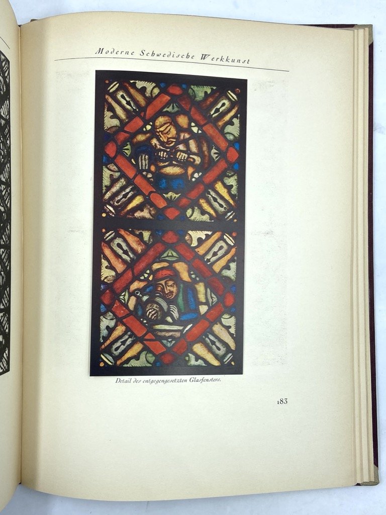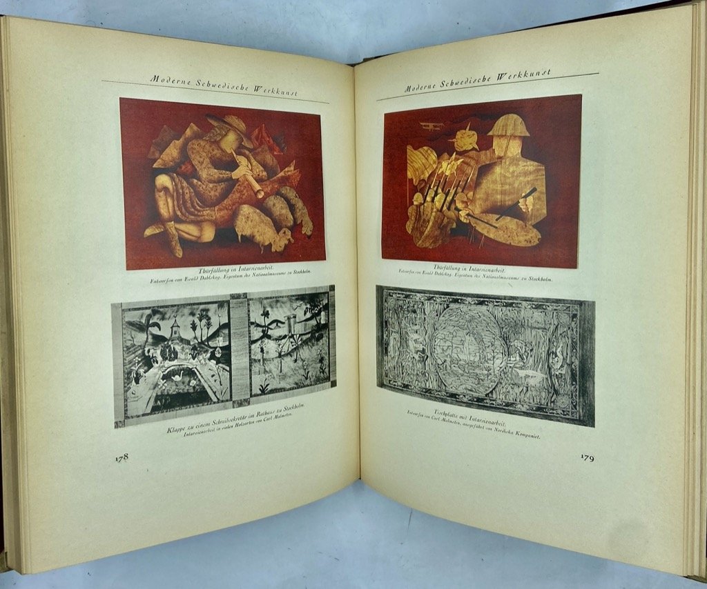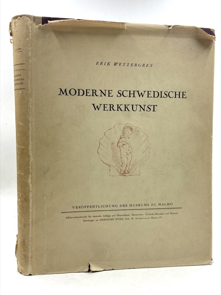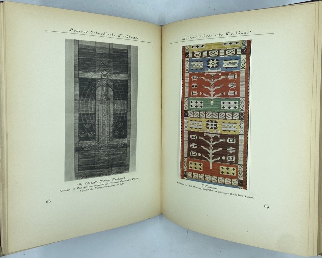 Legatura editoriale in mezza tela con fregio dorato sul piatto anteriore e sovraccoperta a stampa (sciupata), cm 29 x 22, pp (8) 206 (4), numerose illustrazioni in nero (rotocalco) e a colori (applicate) nel testo e fuori testo. Difetti, strappi e mancanze sulla sovraccoperta, ben conservato il volume. Interessante monografia sulle arti applicate in Svezia nel periodo del modernismo e dell’art deco, scritta da Erik Wettergren, tra i principali divulgatori del design svedese in patria e all'estero. Wettergren, che accanto alla carriera curatoriale seguì quella d’uomo di teatro, fu a diverso titolo e a più riprese responsabile dei dipartimenti d'arte e di artigianato del Museo Nazionale di Stoccolma e curò diverse esposizioni di arti applicate a partire dalla Hemutställningen del 1917. Il saggio, accompagnato da alcuni fregi di yngwe Berg, è presentato in traduzione tedesca di E. T. Walter e mostra esempi, dai più tradizionali ai più avanzati, di manufatti tessili, ricami e tappeti, legature e libri, vetri e vetrate, ceramiche, arredi, intarsi, argenteria, fusioni metalliche, ferri battuti, decorazioni murali ecc realizzati da artisti quali Edward Hald, Simon Gate, Eva Bjork, Wilhelm Kage, Henrik Korgh, Gunanr Asplund, Anna Petrus, Agda Osterberg.