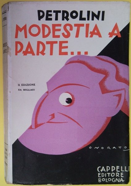 in-8° piccolo (19 x 12,5 cm); pp. 195, (3) e 12 carte di tavole f.t. (fotoriproduzioni di colre seppia su carta patinata, tra cui il fotoritratto dell'autore all'antiporta) ; leg. in brossura editoriale, copertina con fondo bianco, illustrata al piatto ant. a colori da Umberto Onorato (1898-1967), disegnatore, scenografo, illustratore; titolo in rosso e nero al piatto ant., in nero al dorso, in rosso e nero al front., con marca tipografica; numerosi disegni in b/n nel testo di Onorato; novella autobiografica di Ettore Petrolini (1886-1936), attore, macchiettista, cabarettista, commediografo, nato e morto a Roma. Rif.: IT\ICCU\PAL\0088554. Cond.: lievi tracce d'uso, macchia d'umido al piatto post.; opera completa, in ottime condizioni generali.