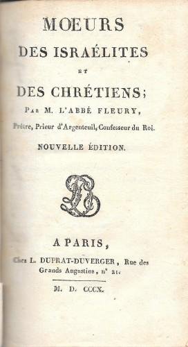 In 12°, pp. viij, 408 ; p/pelle coeva, ds. con tit. e fregi in oro, tagli rossi, richiami marg. Ampio compendio sulle credenze, riti, superstizioni, usi e costumi, feste, matrimoni, funerali, divertimenti, arti e mestieri, educazione dei figli, vita politica, amministraz. della giustizia, guerre, territorio etc. tratte dai testi sacri e dagli scritti antichi delle due religioni da parte dell'A. della monumentale "Histoire ecclésiastique" in 20 volumi; piccolo foro al marg. inf. di alcune pp. senza perdita di testo e qc. fior. 518/38