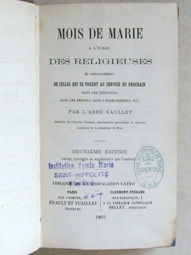 Mois de Marie à l'usage des Religieuses et spécialement de celles qui se vouent au service du prochain dans les hôpitaux, dans les prisons, dans l'enseignement, etc.