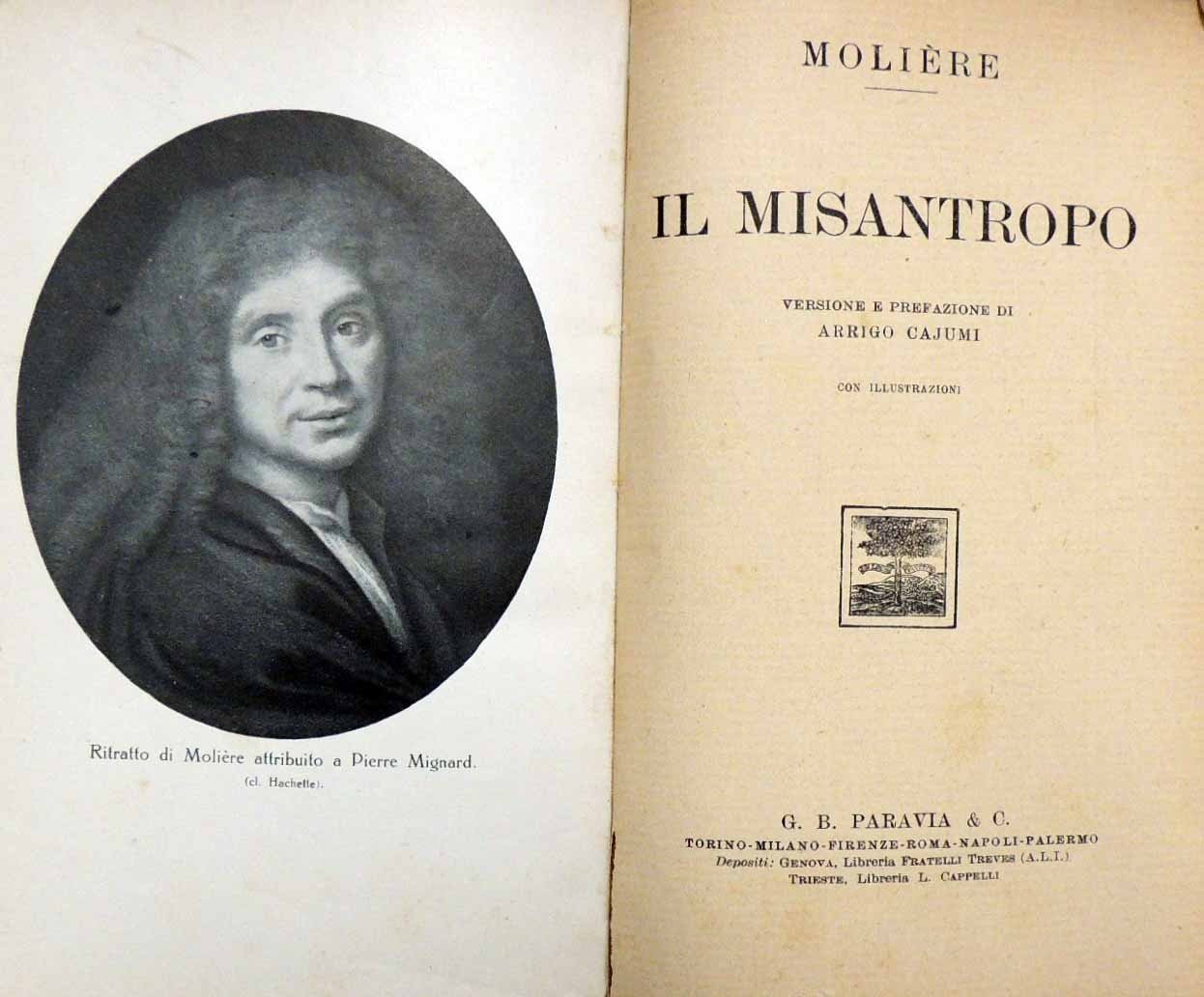Molière, Il misantropo, versione e prefazione di Arrigo Cajumi, G. B. Paravia e C., Torino 1924, pp. 86, 2 c. di tav. f.t. ill. b.n., cm 19, legatura in mezza tela nera con titoli manoscritti al dorso. Firma d’appartenenza al retro della prima tavola. Due carte dell’introduzione legate con lieve rientro rispetto alle altre tanto da presentare conseguente assenza di margine interno, per il resto lievi tracce d’uso, minima brunitura della carta, ma nel complesso copia in condizioni accettabili.