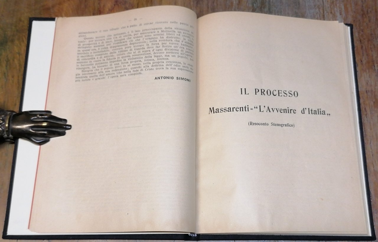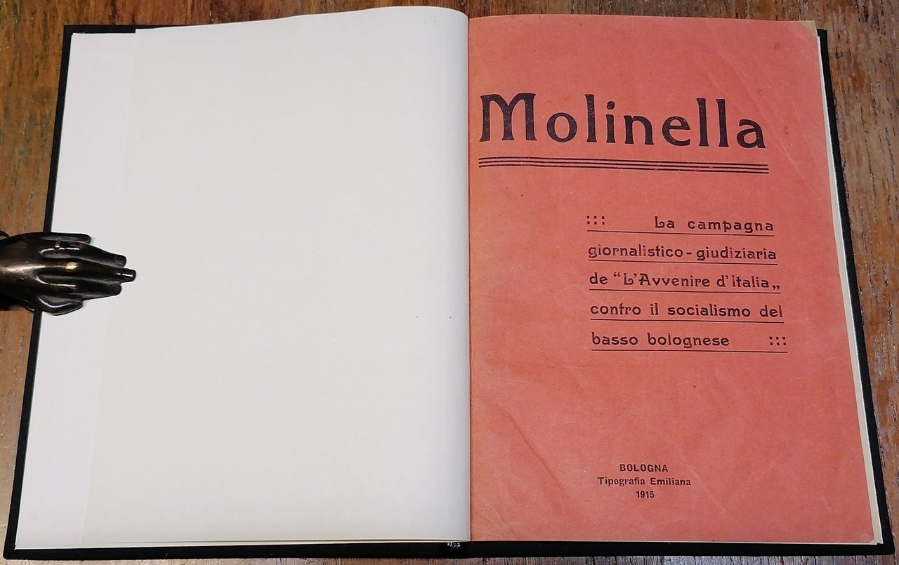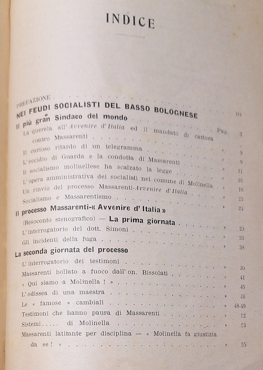 (Storia del socialismo in Emilia Romagna - Bassa bolognese - Il processo Massarenti, gli articoli di Antonio Simoni su "L' Avvenire d'Italia" quotidiano cattolico) In 8°, legatura in piena tela nera, copertine della brossura originale conservate all'interno, al piatto anteriore della legatura è stata applicata una scansione della prima di copertina, pp. XVI,110, con un facsimile a doppia pagina nel testo. Prefazione di Carlo Malvezzi Campeggi. Ex libris nobiliare in seconda di copertina. Edizione originale, ben conservata.