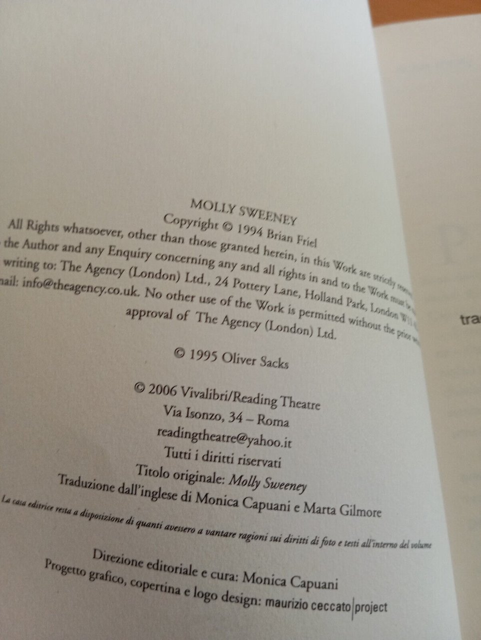 Molly Sweeney Brian Friel Oliver Sacks, Vedere e non vedere Reading Theatre 2006