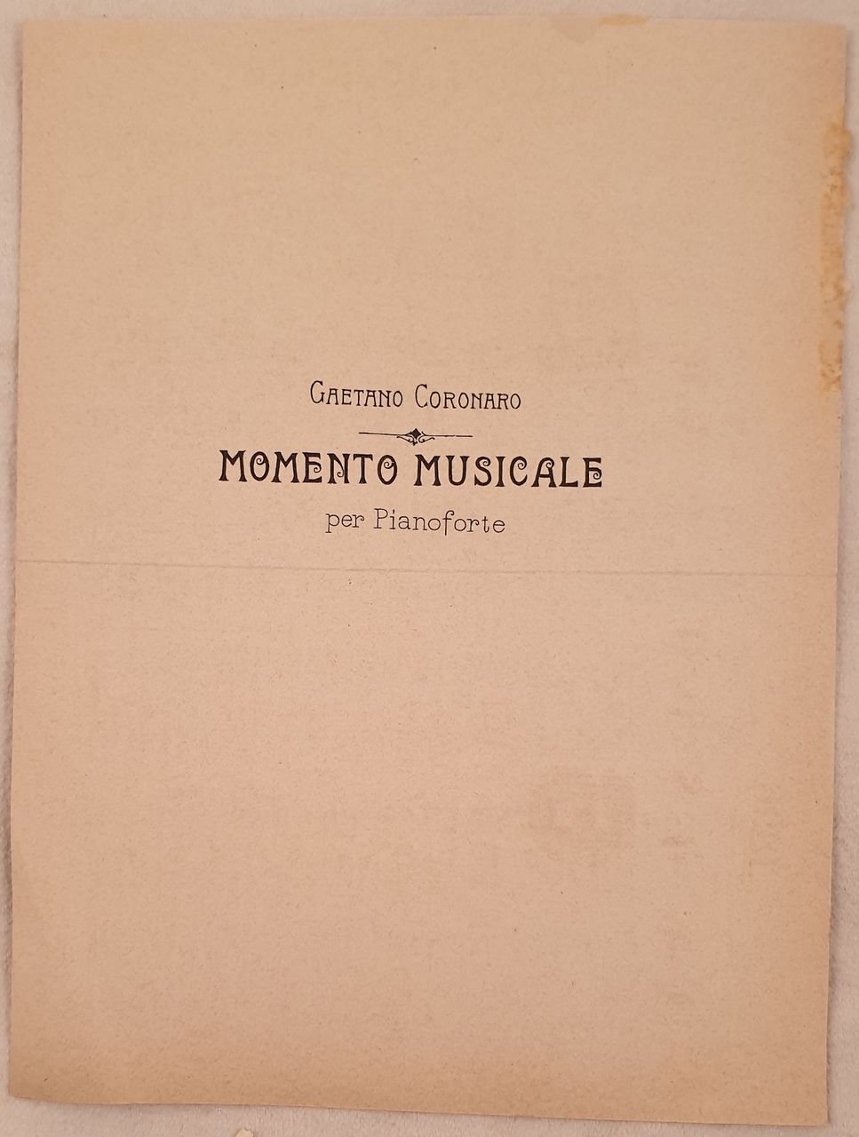 Edizione dei primi del novecento di questo spartito per pianoforte del pezzo "Momento musicale" del compositore vicentino Gaetano Coronaro (1852-1908). Ottime condizioni, rare fioriture. Piegatura orizzontale. In 8. cm 25x19. pp. 3.Edition of early 20th century of this musical score for piano of the piece "Momento musicale" by the composer from Vicenza Gaetano Coronaro (1852-1908). Very good conditions. Horizontal folding In 8. cm 25x19. pp. 3.
