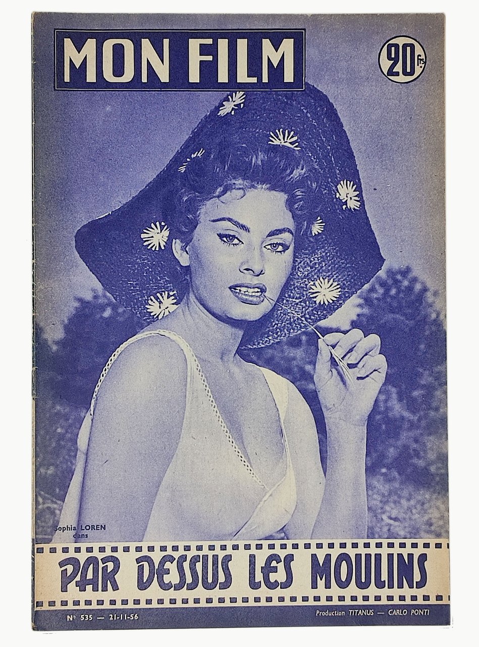 N° 535 del 1956 (21 - 11 - 56) della celebre rivista settimanale francese, illustrata, 'Mon Film'. Production TITANUS - Carlo Ponti. Imp. Crété Paris. Numero dedicato a Sophia Loren e al film 'Par Dessus les Moulins' (in cui recitarono ance Vittorio De Sica e Marcello Mastroianni). Directeur de la publication: A. Rayez. Formato: 14 pagine. Ampiamente illustrato con numerose fotografie. Esemplare decisamente ben conservato.