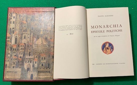 In 8°; CXI, (1), 303, (5) pp. e 11 c. di tav. fuori testo. Legatura editoriale in simil-pelle rossa con titolo e fregi in oro al dorso ed ai piatti. Acetato protettivo editoriale. Custodia editoriale. Tiratura limitata di soli 3000 esemplari, in nostro è l'esemplare numero 970. Bell'edizone delle epistole politiche di Dante. Ottimo esemplare.