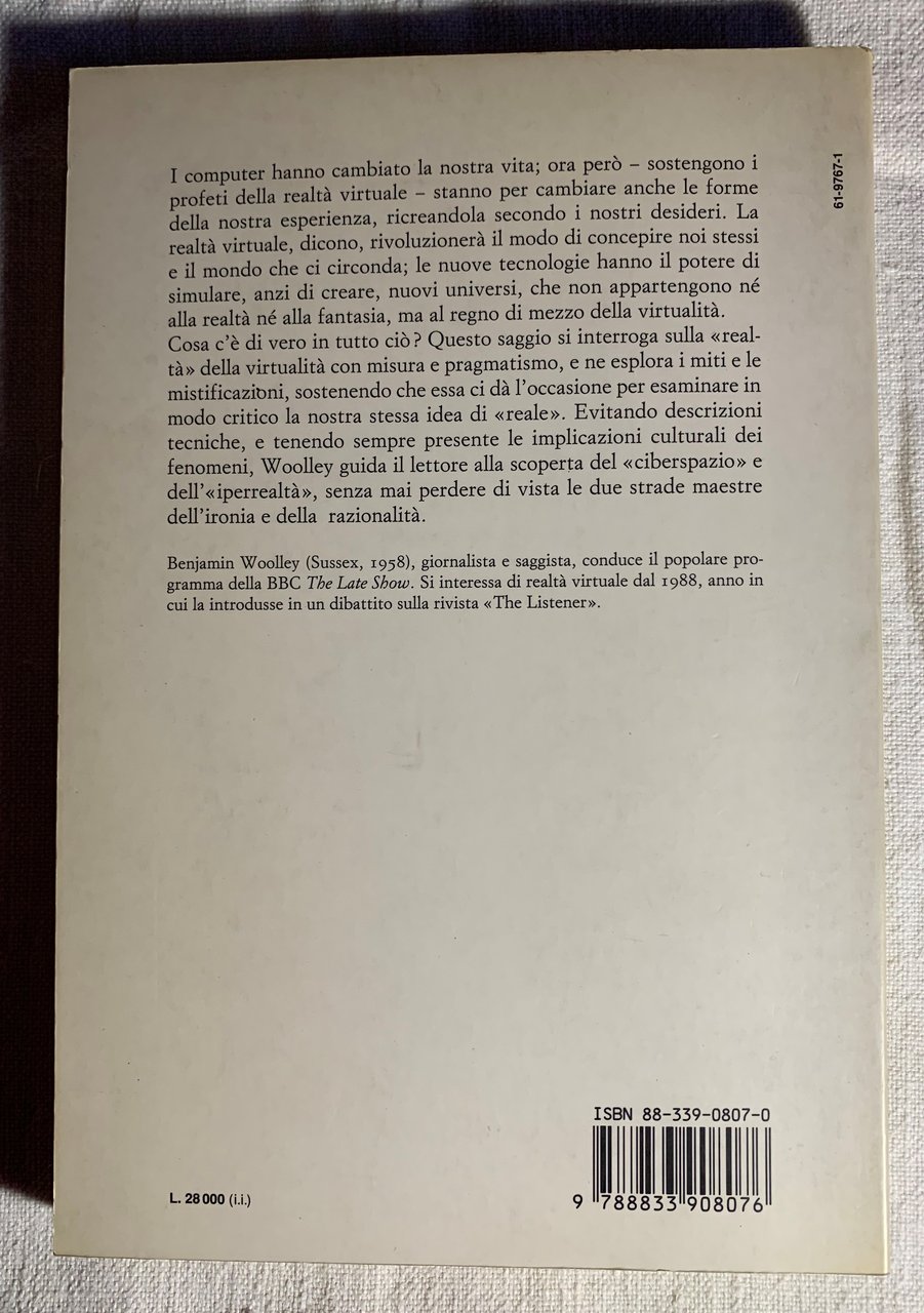 I ed. italiana: ottobre 1993 (ed. originale: Virtual Worlds, Blackwell Publishers 1992). Traduzione di David Mezzacapa. Collana Saggi. VIII/ 322+(6)=328/ brossura satinata e illustrata a colori al primo piatto. Stato buono.