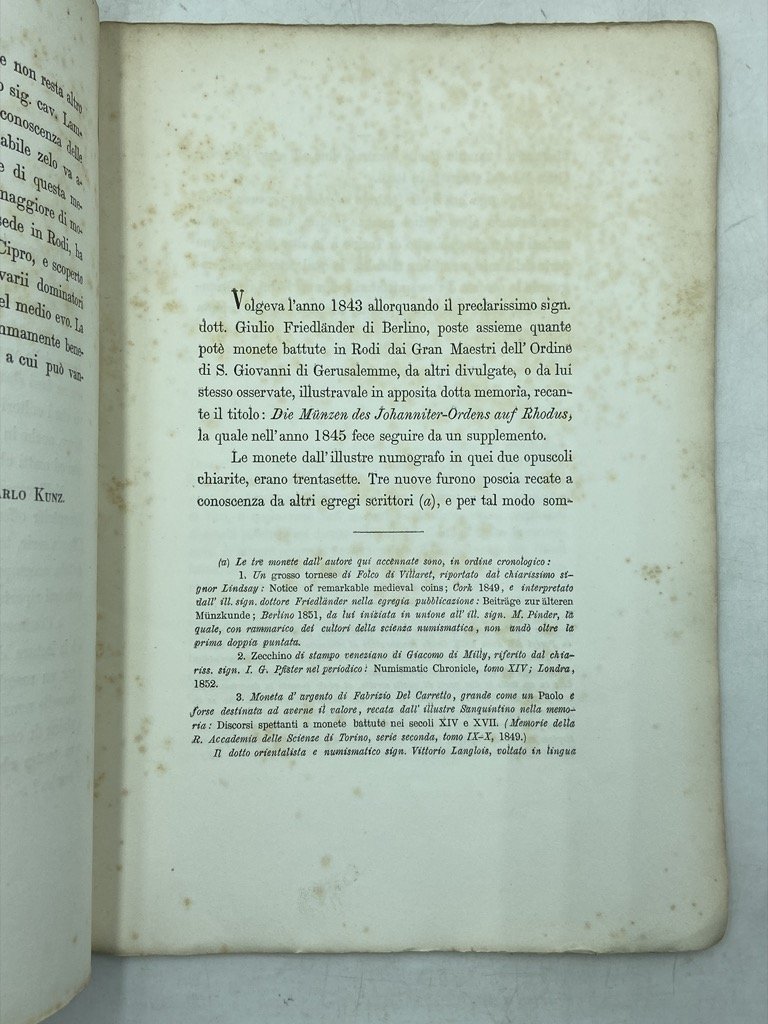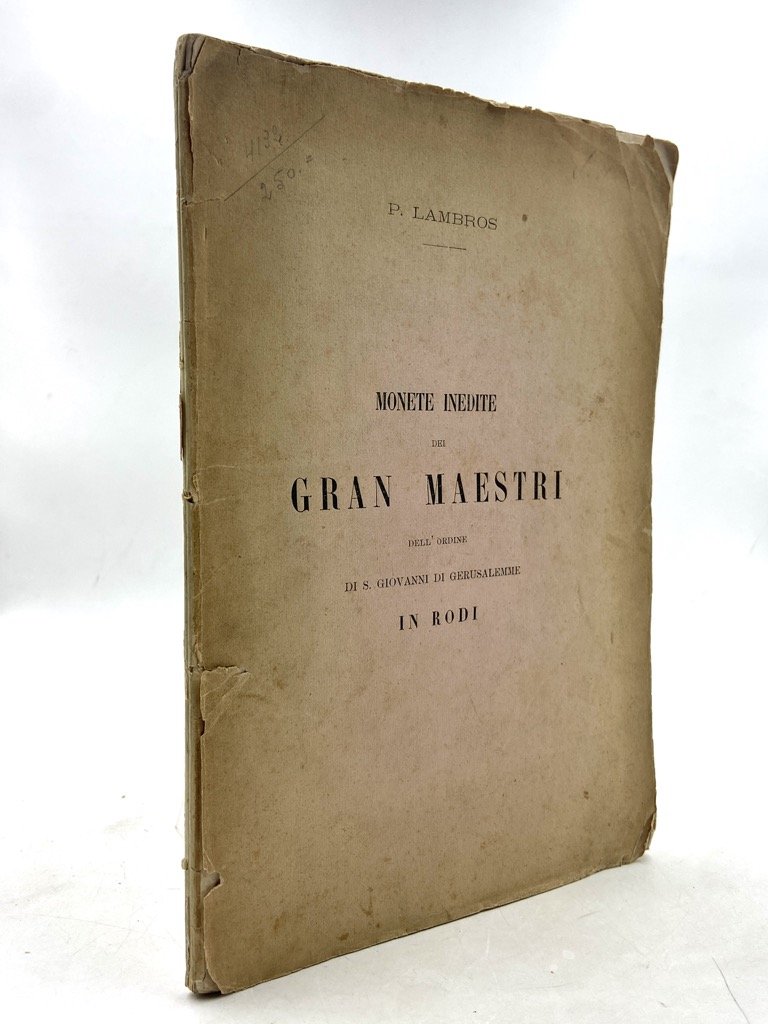 Brossura editoriale a stampa, cm 25.5 x 17.5, pp 36, una tavola fuori testo. Brossura con segni d'uso, ritaglio sulla prima carta bianca, piccolo timbro di numismatico torinese sul frontespizio, arrossamenti sparsi. Edizione originale di questa memoria inizialmente pubblicata in greco su periodico nel 1859 e qui tradotta da Carlo Kunz. Paulos Lampros fu con il figlio Ioannes tra i maggiori e più esperti e attivi mercanti di antichità e monete nella seconda metà del secolo XIX, autore di numerosi studi sulla monetazione greca antica e medievale, dei crociati, degli italiani nell'arcipelago.