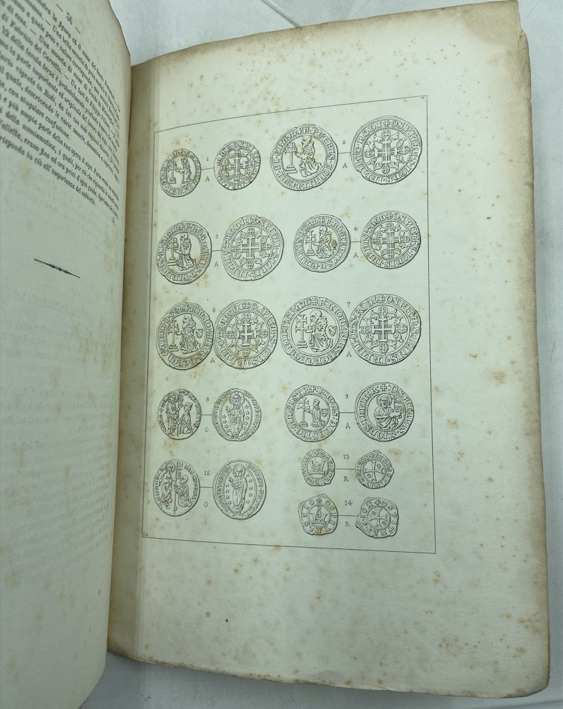 - Esemplare da studio, da rilegare. Brossura con segni d’uso e dorso mancante, ritaglio quadrato sulla prima carta bianca (rimossa una dedica?), piccolo timbro di numismatico torinese sul frontespizio, arrossamenti sparsi.