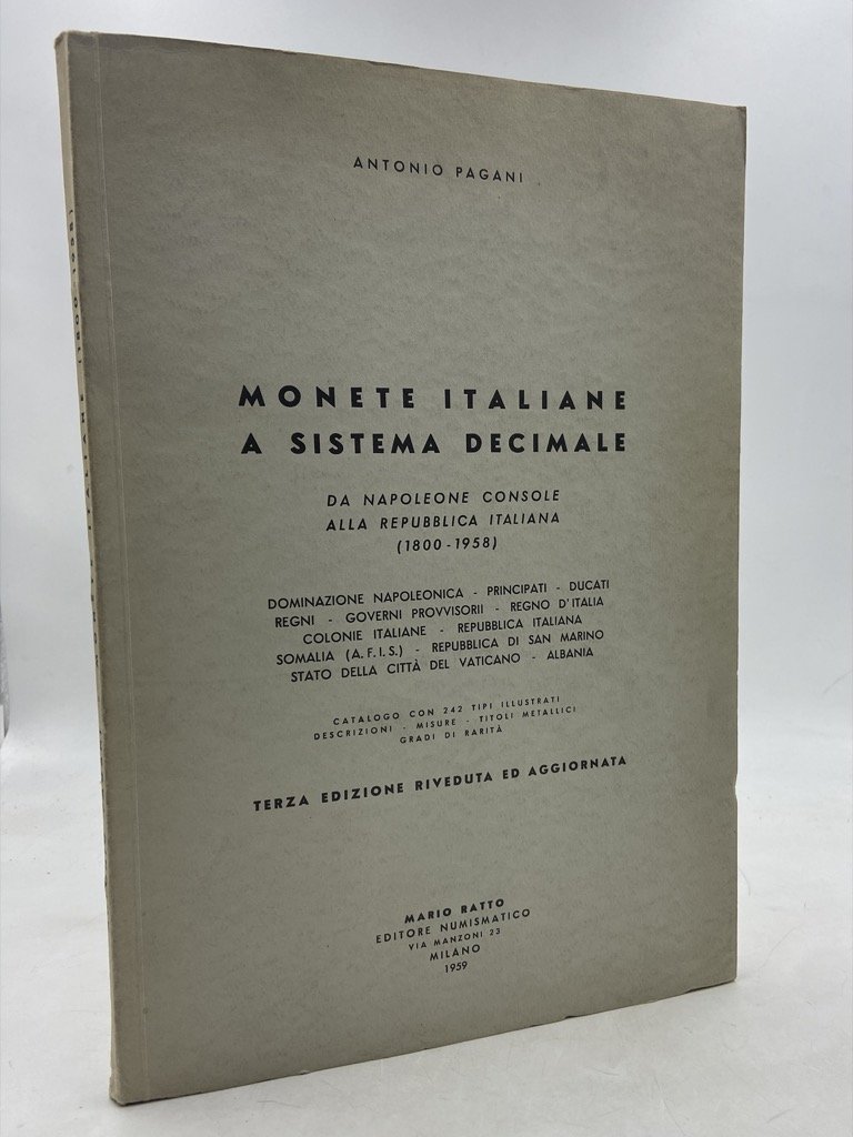 Brossura editoriale a stampa, cm 28 x 19.5, pp 110 (2) illustrate in nero. Con Ex libris al primo contropiatto. Buono stato. Terza edizione riveduta e aggiornata, catalogo con 242 tipi illustrati con descrizioni, misure, titoli metallici, gradi di rarità. Dominazione napoleonica, Principati, Ducati, Regni, Governi provvisori, Regno d’Italia, Colonie Italiane, Repubblica Italiana, Somalia (A.F.I.S.), Repubblica di San Marino, Città del Vaticano, Albania.
