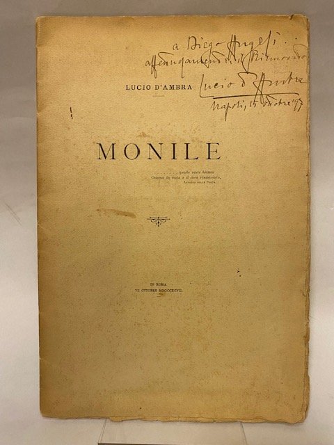 Edizione originale stampata in proprio in 50 esemplari numerati a mano (ns. 23) in carta pesante e con barbe. Brossura avorio con titoli in nero al piatto e colophon alla quarta di copertina. Rara autoproduzione, raccolta di poesie pregiata da una bella dedica dell’autore.