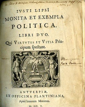 In-4° (258x177mm), pp. (8), 213, (5) di approvazioni, privilegi ed explicit tipografico, (1) di impresa tipografica in xilografia con la figura di una mano intenta a tracciare un cerchio con un compasso, tra due figure allegoriche, entro cornice con putti e grottesche con motto entro cartiglio: 'Constantia labore'. Cartonatura decorata recente. Al frontespizio, vignetta calcografica con la variante del motivo iconografico della mano reggente il compasso ed eguale motto latino, con festoni e due figure allegoriche affiancate. Ex-libris manoscritti secenteschi alla medesima carta. Dedica a stampa ad Alberto, Arciduca d'Austria, Duca di Burgundia e Principe del Belgio. Alcuni capilettera xilografici figurati e alcuni cul-de-lamps. Un indice preliminare. Varie bruniture e aloni, restauri al margine inferiore delle prime 8 carte. Editio princeps di uno dei maggiori trattati lipsiani di filosofia politica, disquisizione sulle virtù ed i vizi dei governanti fondata su numerose esemplificazioni storiche spazianti da Dionisio di Siracusa a Carlo V ai Khan tartari. Attraverso uno svolgimento precettistico più che tramite una sistematica teoria delle forme di governo, Giusto Lipsio fornisce la propria visione delle istituzioni monarchiche e dei compromessi inerenti alla politica, preferendo, tra i diversi mali, l'autoritarismo del despota ai perniciosi contraccolpi suscitati dai moti rivoluzionari, e ritenendo inevitabile frutto di una provvidenziale ciclicità il succedere dei buoni principi a quelli cattivi. L'opera fu tradotta in numerose lingue europee, tra cui il russo e il polacco. Bibliographia Belgica, L-377. Simoni, L-163.