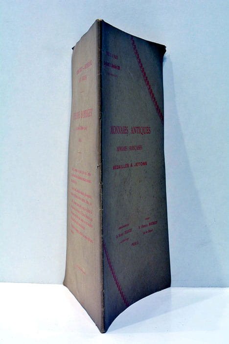 22 pages. 2 feuillets. (20,5x13,5cm). Broché. Couverture imprimée brunie avec petites atches éparses. Coins émoussés. Cet ouvrage, publié à Paris en 1902, se présente comme un catalogue détaillé destiné à accompagner une vente aux enchères publiques de monnaies antiques, françaises, médailles et jetons. À l'exception du papier bruni, exempalire bien conservé.