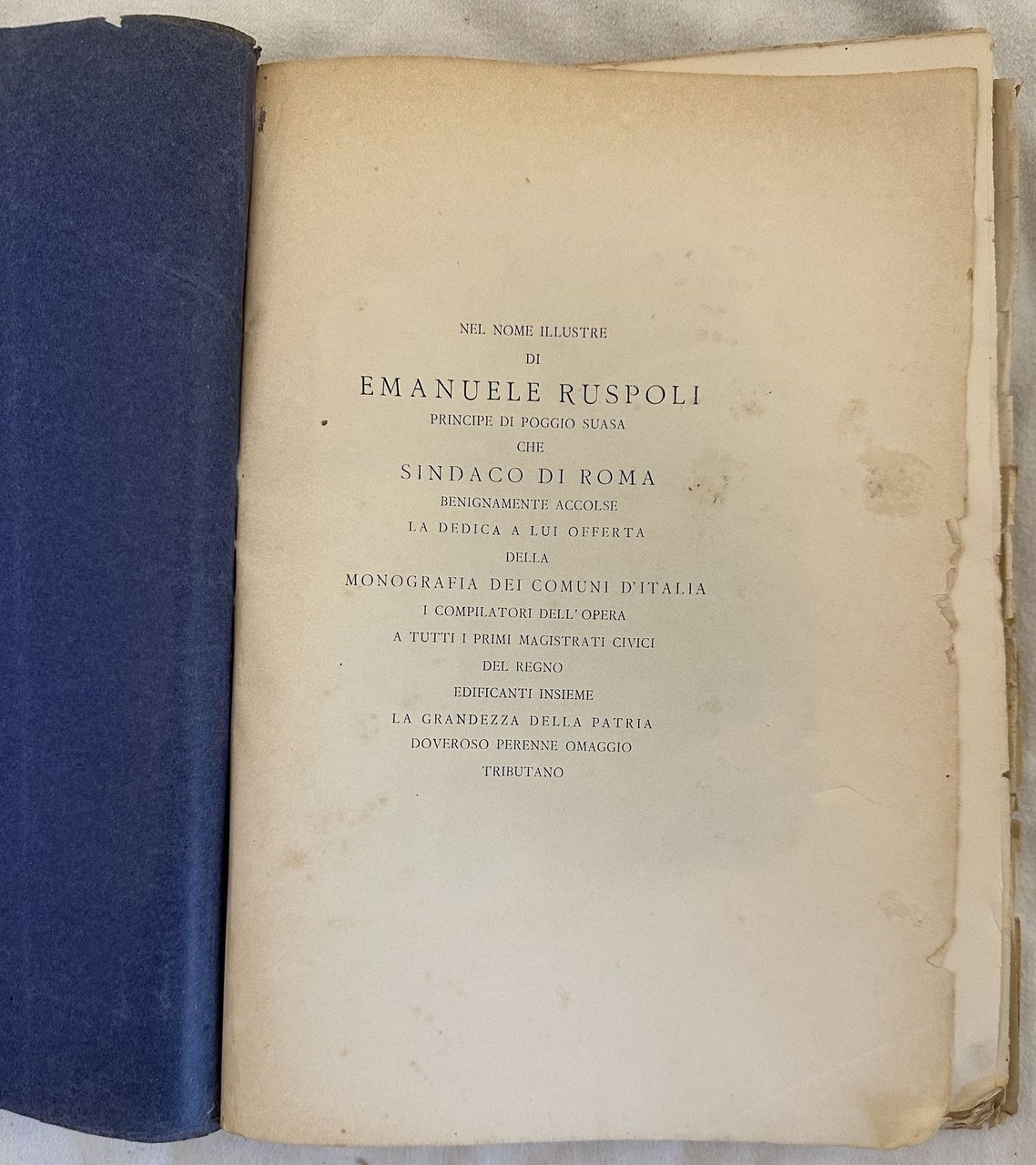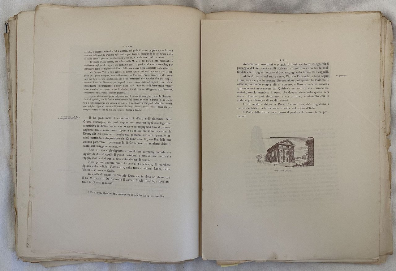 Interessante monografia sulla città di Roma. Il volume è privo di frontespizio ma stampato del 1895 come si evince dalla prefazione. Dedica al principe Emanuele Ruspoli. All'interno sono presenti numerose illustrazioni e tavole fotografiche di scene storiche e ritratti (La Marmora, Alluvione del 28 dicembre 1870, Arrivo di Vittorio Emanuele in Roma, Bombardamento di Ancona, Alluvione del 28 dicembre 1870 ecc In buone condizioni. Copertina morbida con parte di brossura incollata al piatto anteriore in mediocri condizioni generali. Legatura quasi assente. Pagine si presentano in buone condizioni con fioriture. In 4. Dim. 30,5x22 cm. Pp. 336.Interesting monography of the city of Rome. The volume is without title page but published in 1895 as indicated in the prefation. Dedication to the Prince Emanuele Ruspoli. Inside there are different illustrations and photographic plates of hystorical scenes and portraits (La Marmora, Alluvione del 28 dicembre 1870, Arrivo di Vittorio Emanuele in Roma, Bombardamento di Ancona, Alluvione del 28 dicembre 1870 ecc In good conditions. Soft cover with prt of editorial cover attached in the front plate in poor conditions lightly worn in the extremities. Binding almost lacks. Pages are in good conditions with foxing. In 4. Dim. 30,5x22 cm. Pp. 336.