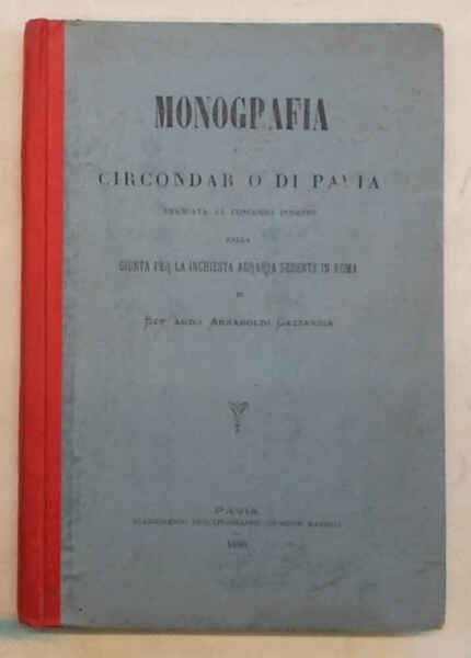 In 8° (cm. 23,5 x 16,5); pagg. VIII, 207, (2); con 1 grande e bella carta topografica del Circondario di Pavia in scala 1:100.000 di cm. 45 x 63 più volte ripieg. f.t.; ottima mezza tela origin. VG. ** Edizione originale e unica. Rara. "Premiata al concorso indetto dalla Giunta per la Inchiesta Agraria sedente in Roma".