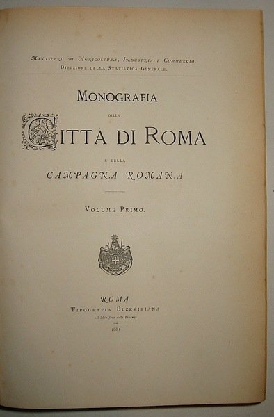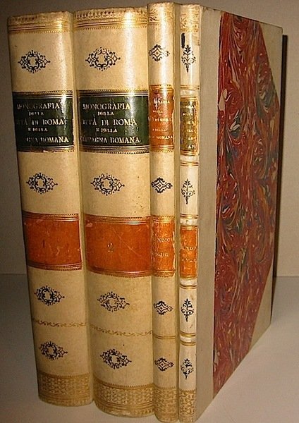 4to (cm. 26,4), 4 Voll.; 2 cc.nn., CII pp., 2 cc.nn., CXXIII-(1)79(1) pp., da p. CLXIII a p. CLXXIX, da p. (1)81 a p. 389 con 7 tavv. rip.; 2 cc.nn., 573, 111(1) pp., da p. CCXVII a p. CLXII con 12 tavv. f.t. anche rip. (segue) Monografia della città di Roma e della campagna romana. Appendice. Bibliografia storica di Roma antica di Ruggero Bonghi, ibidem 1881, 1 c.nn., 177 pp. (segue) Monografia della città di Roma e della campagna romana. Appendice. Note alla carta agronomica dei dintorni di Roma per Raffaello Canevari, ibidem 1881, 1 c.nn., 76 pp. Belle legature coeve in mz. pergamena con angoli, fregi e titoli oro su doppio tassello di diverso colore al ds. Carte di guardia a pettine. Ex libris ai contropiatti anteriori. Ottimo esemplare. Opera completa.