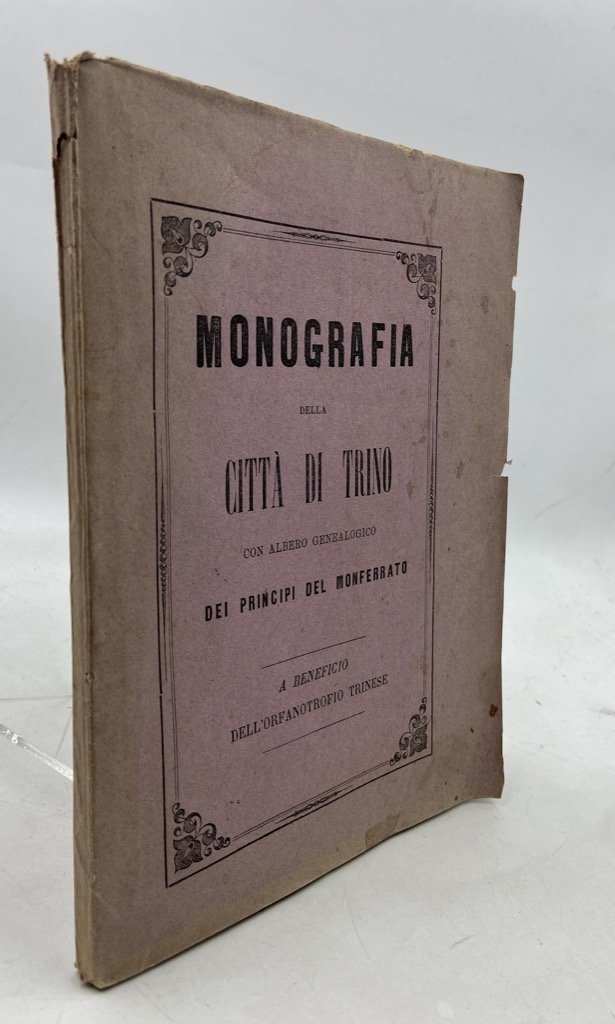 Brossura editoriale a stampa, in ottavo cm 20x15, pp 128 (2), un’ampia tavola ripiegata con Alberto Genealogico dei Principi del Monferrato. Buon esemplare, completo e genuino, lievi segni d'usura sulla copertina. Seconda edizione, pubblicata a beneficio dell’Orfanotrofio Trinese, di questa monografia storica pubblicata per la prima volta nel 1872 e qui corretta e arricchita di notizie sui fatti recenti. L’opera fu concepita dall’autore come necessaria rettifica di «certi errori occorsi nella traduzione della Storia Patria del celebre Irico», ed è notevole tra l’altro per le notizie sulle vicende risorgimentali in città e per il capitolo dedicato agli stampatori trinesi, con elenchi dei titoli pubblicati e biografie. In apertura recensioni alla prima edizione e un Preambolo che lamenta soprattutto la mancanza di collegamenti ferroviari.le a stampa, in ottavo cm 20x15, pp 128 (2), un’ampia tavola ripiegata con Alberto Genealogico dei Principi del Monferrato. Seconda edizione, pubblicata a beneficio dell’Orfanotrofio Trinese, di questa monografia storica pubblicata per la prima volta nel 1872 e qui corretta e arricchita di notizie sui fatti recenti. L’opera fu concepita dall’autore come necessaria rettifica di «certi errori occorsi nella traduzione della Storia Patria del celebre Irico», ed è notevole tra l’altro per le notizie sui fatti delle guerre d’indipendenza in città e per il capitolo dedicato agli stampatori trinesi e alle origini della tipografia In apertura recensioni alla prima edizione e un Preambolo che lamenta soprattutto la mancanza di collegamenti ferroviari. Lozzi, 5650.