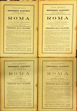 Quattro Voll. In 8° (cm 26 x 18,8), pp. 141 + 175 + 184 + 175. Bross. dorso nero muto. Sovrac. in carta velina brunita. Lievi segni di consunzione ai margini e alle cuffie. Cofanetto cart. Segni di consunzione, strappetti e mancanze ai margini dei cofanetti. Parte I: Dalle origine al Regno di Costantino. II edizione riveduta da Giuseppe Lugli. Con 135 illustrazioni e 1 tavola da fotografie dirette in gran parte inedite. Parte II: Da Costantino al Risorgimento. Con 160 illustrazioni da fotografie dirette in gran parte inedite. Parte III: Il Rinascimento. Con 190 illustrazioni. Parte IV: Roma Barocca e Moderna. Con 192 illustrazioni e 1 tavola da fotografie dirette in gran parte inedite. Buone condizioni.