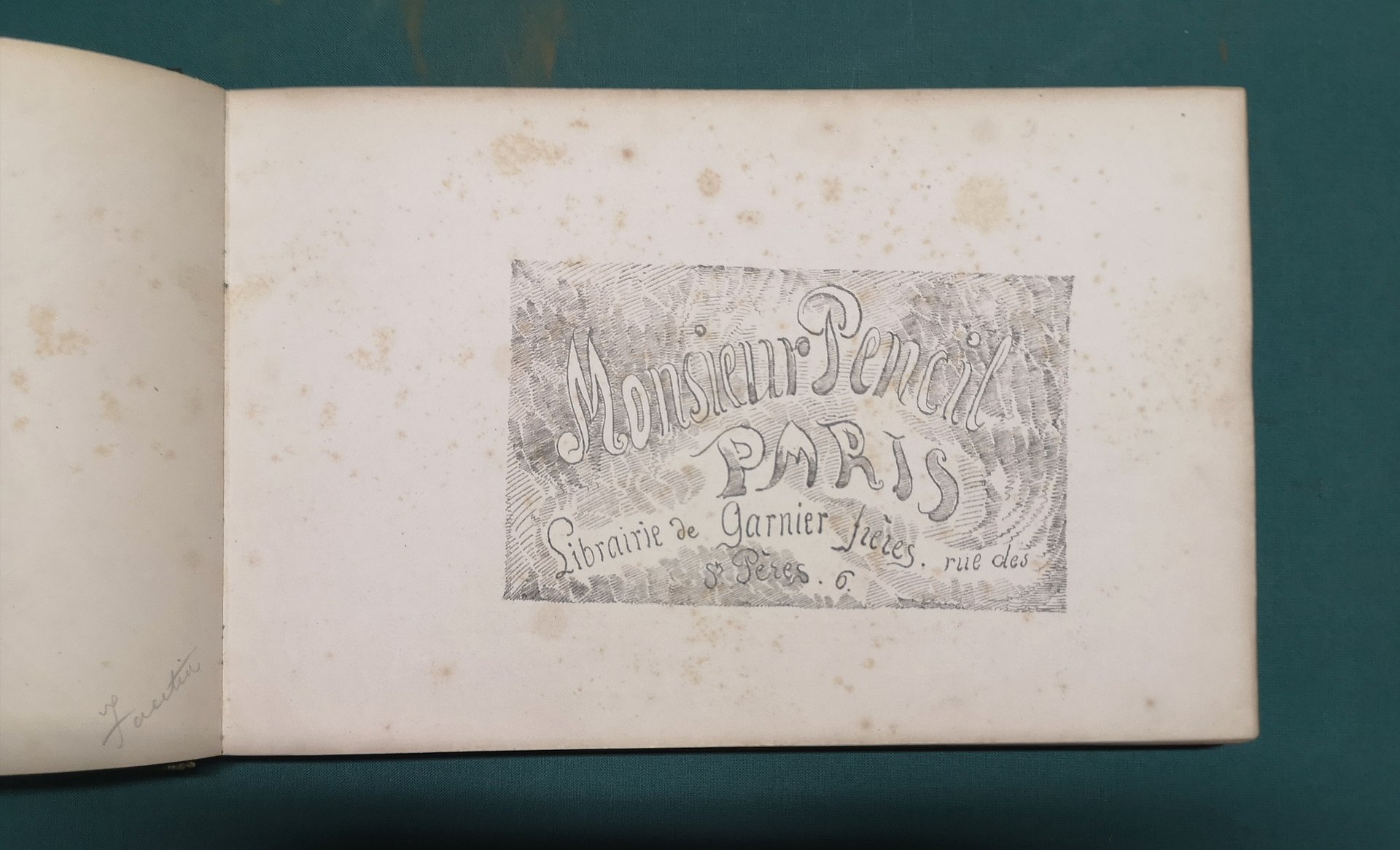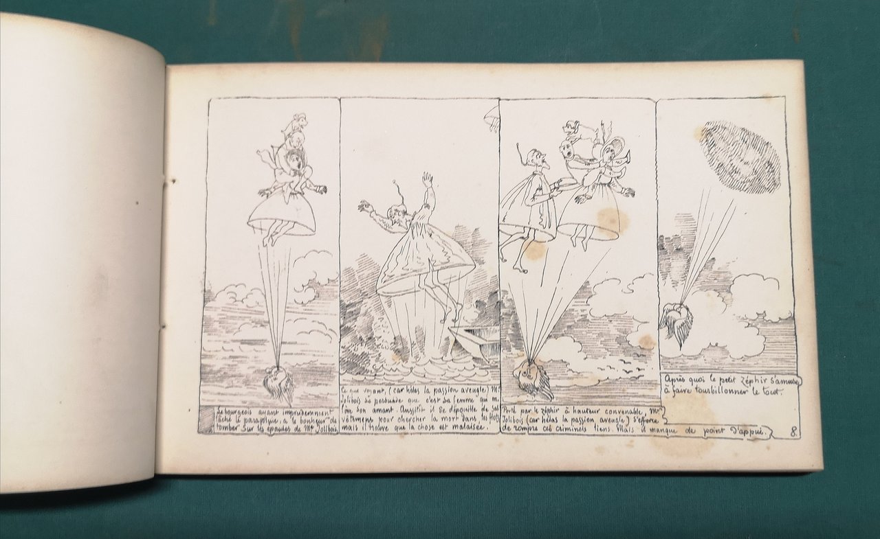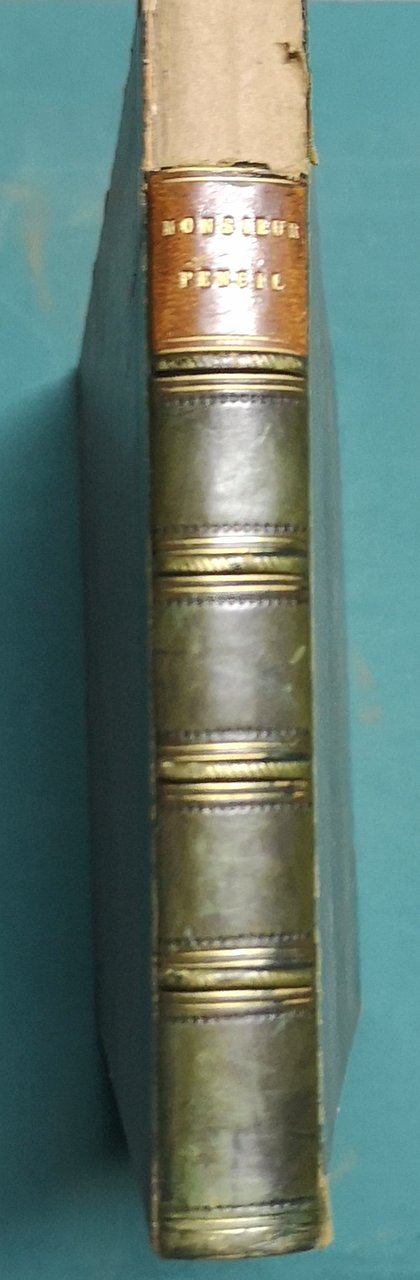 >in-8 oblungo, ff. 72 interamente figurati al solo verso da disegni di Topffer litografati da Caillet. Legatura coeva in m. pelle verde e angoli, titolo in oro su tassello, dorso a nervi con minute impressioni a secco (purtroppo mancante il primo compartimento in testa al dorso). Prima edizione parigina di questa storia in formato “bande dessinée”, ovvero a fumetti, di cui Topffer viene considerato l'indiscusso creatore. Buon esemplare.