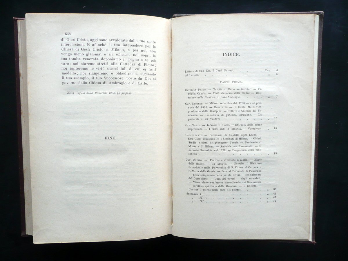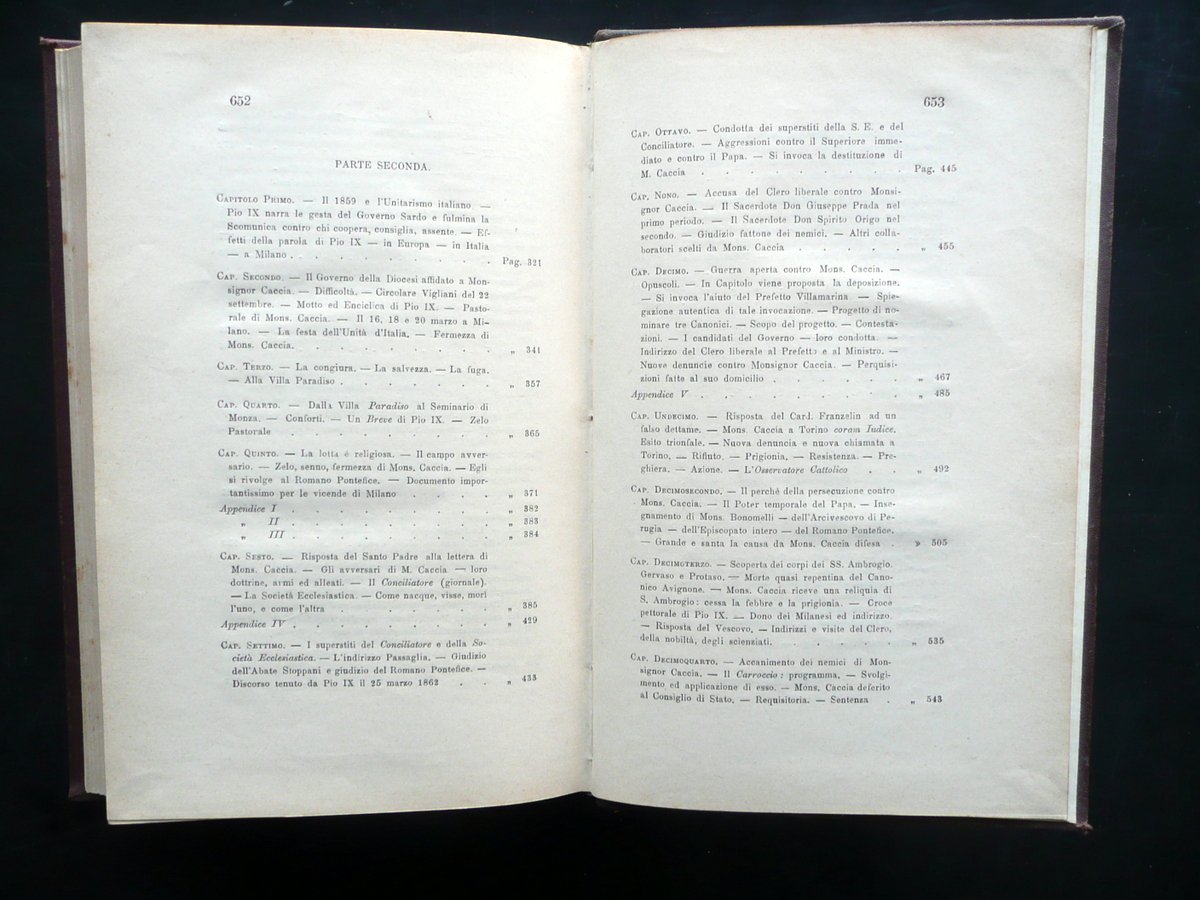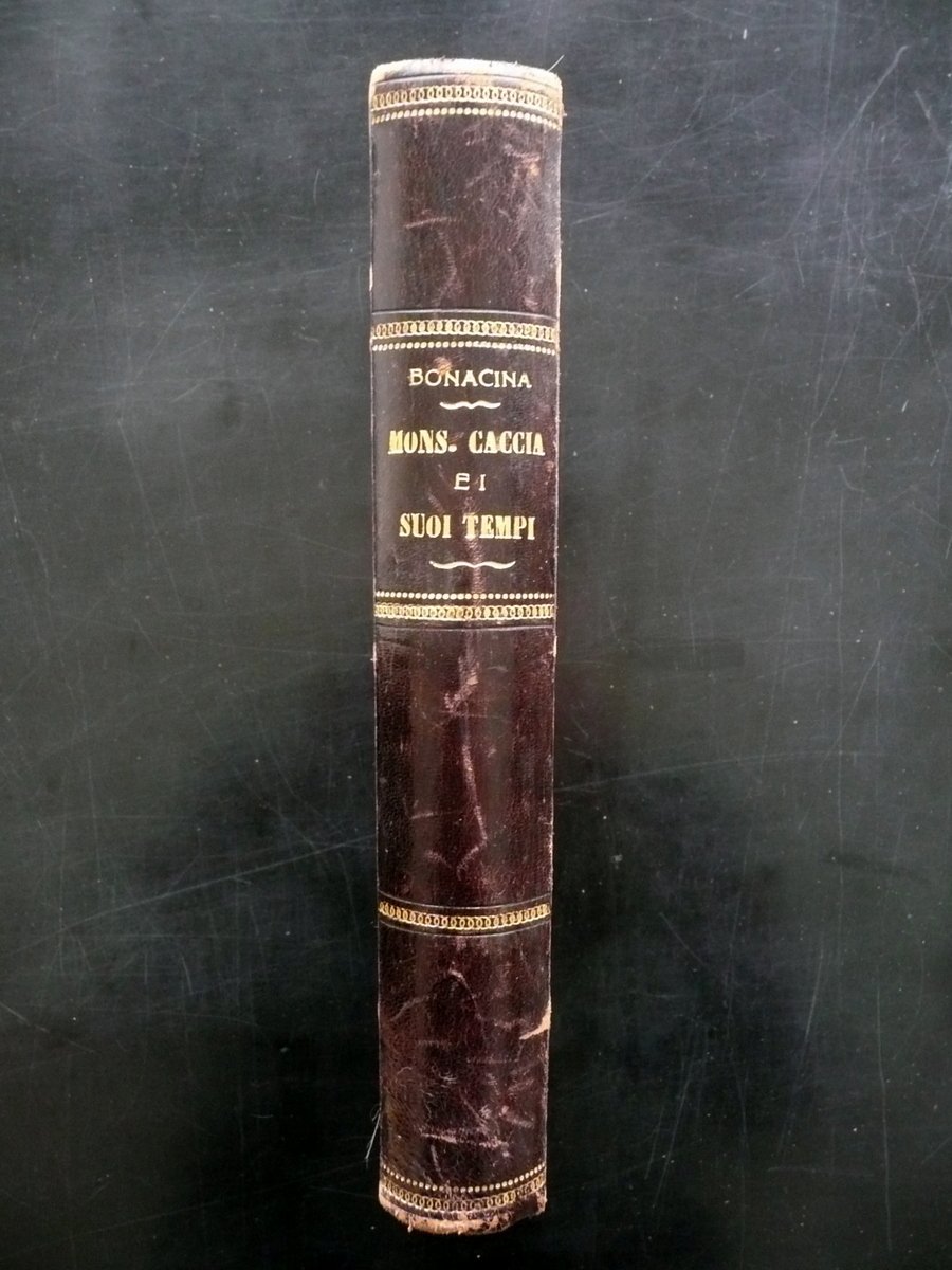 Sac. Carlo Bonacina, Monsignor Carlo Caccia e i suoi tempi memorie storiche 1802 - 1866 Premiata Tip. Pontif. ed Arciv. S. Giuseppe, Milano 1906; cm 23x14,5; pp. 654 con un ritratto fotogr. in b/n all'antiporta; legatura d'epoca in mezza pelle con titolo e fregi impressi in oro al dorso, piatti telati. Condizioni di conservazione Esemplare ben conservato con tracce d'uso, coperta con alcune piccole abrasioni e graffietti principalmente al dorso. Interni buoni con qualche piccola leggera brunitura; minimi accenni d'ingiallimento ai margini delle pagine. Biografia di Monsignor Carlo Caccia Dominioni, vescovo milanese, esempio di intransigenza cattolica: all'indomani dell'unità d'Italia si rifiutò di riconoscere il neonato regno a guida sabauda, e per questo fu di fatto costretto all'esilio nella sua vita di Cornate d'Adda fino alla sua morte, avvenuta nel 1866. Rara edizione orginale del 1906. SETT159.L14862 N