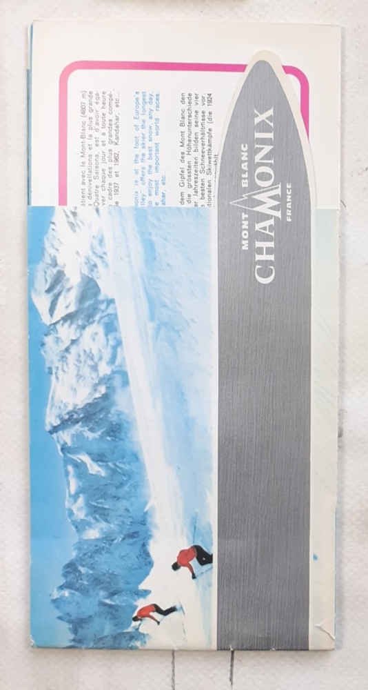 Pieghevole di 16 facciate di cm. 10 x 20,5; con bella illustrazione panoramica grafica a volo d'uccello a pieni colori della valle con indicazione degli impianti e delle discese, da Argentiere a Les Houches; numer. illustraz. fotografiche a colori; copertina con illustraz. a colori e curiosa "aletta" a forma di sci. VG. ** Bello! Testo in francese. "La neige de Chamonix Mont Blanc. est poudreuse". In francese.