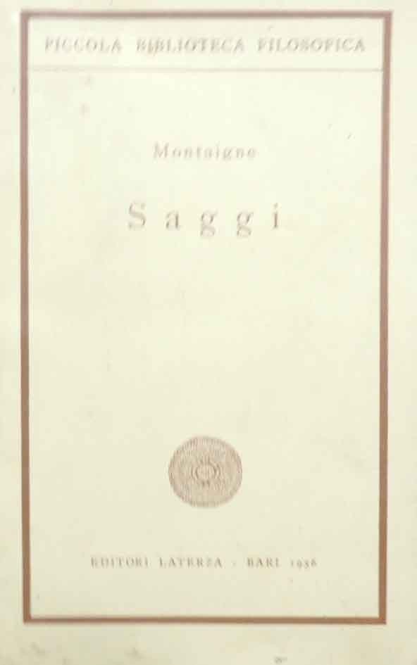 Michel de Montaigne, Saggi. Estratti, a cura di Armando Vedaldi, Editori Laterza, Bari 1956, seconda ed. accresciuta, pp. 178, cm 20, br. ed. Collana Piccola Biblioteca Filosofica. Leggere tracce d’uso, minime abrasioni alla brossura, per il resto ben conservato. Intonso.