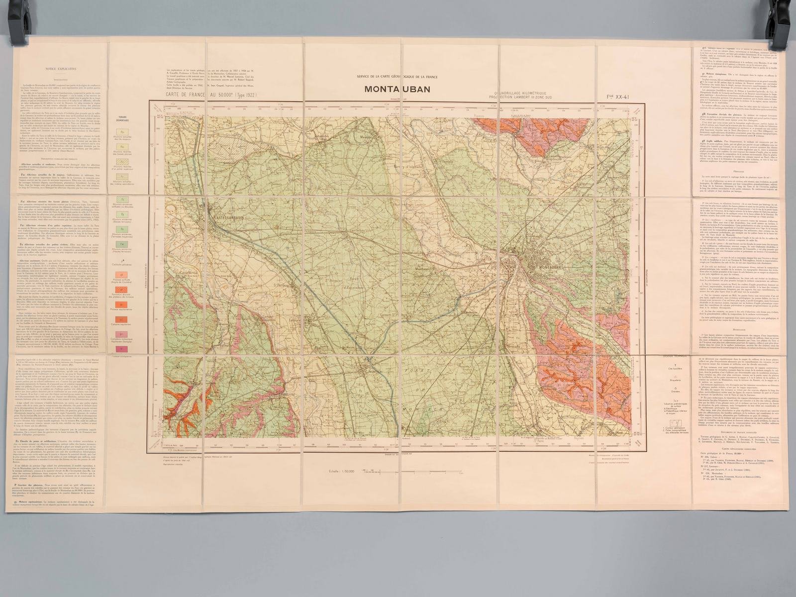 Carte entoilée dépliante en couleurs format 94 x 60,5 cm, carte numéro XX-41 au 1/50 0000, 1962, Société Nouvelle de Cartographie Belle carte géologique ancienne aussi intéressante que décorative et méritant d'être encadrée. Les explorations et les tracés géologiques ont été faits de 1957 à 1958 par A. Cavaillé, la feuille a été publiée en 1962, Jean Goguel Inspecteur Général des Mines. Bel état pour cette carte contenant en marges verticales l'intégralité des explications avec sa notice explicative (mention manuscrite "Montauban" sur l'épaisseur pour l'identifier, discret cachet d'ex-libris, très bel état par ailleurs). La carte comprend une partie de la région de confluence Garonne Tarn Aveyron. Les trois vallées y sont représentées avec de petites parties de leurs versants